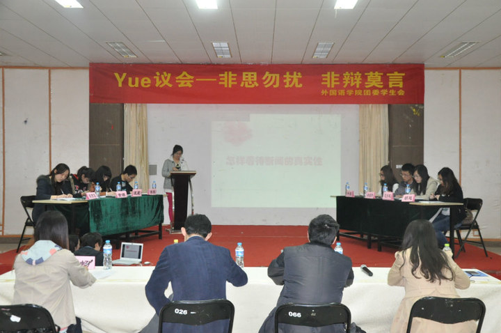 4月1日,十三水在线 在将军路校区艺术中心多功能厅举办了十三水在线 首届“Yue”议会。十三水在线 英语系副主任王孝存老师、学生处事务科科长张跃作为评委参加了此次会议。