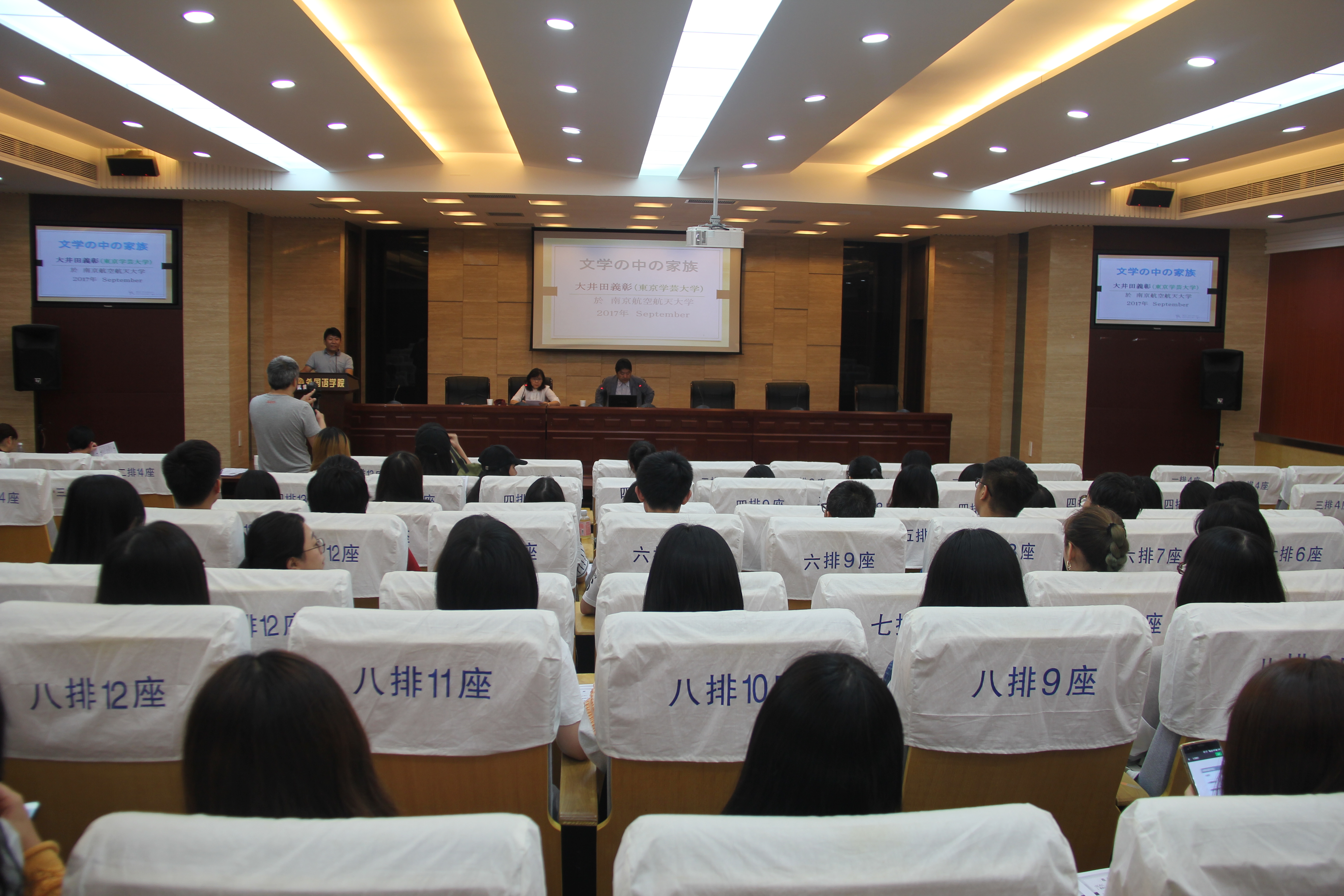 9月22日,东京学艺大学大井田義彰教授应邀在十三水在线 做了题为“文学中的家族”的精彩学术讲座。日语系主任窦硕华主持讲座。日语系张晋文副教授进行翻译,全系80余位师生聆听了讲座。