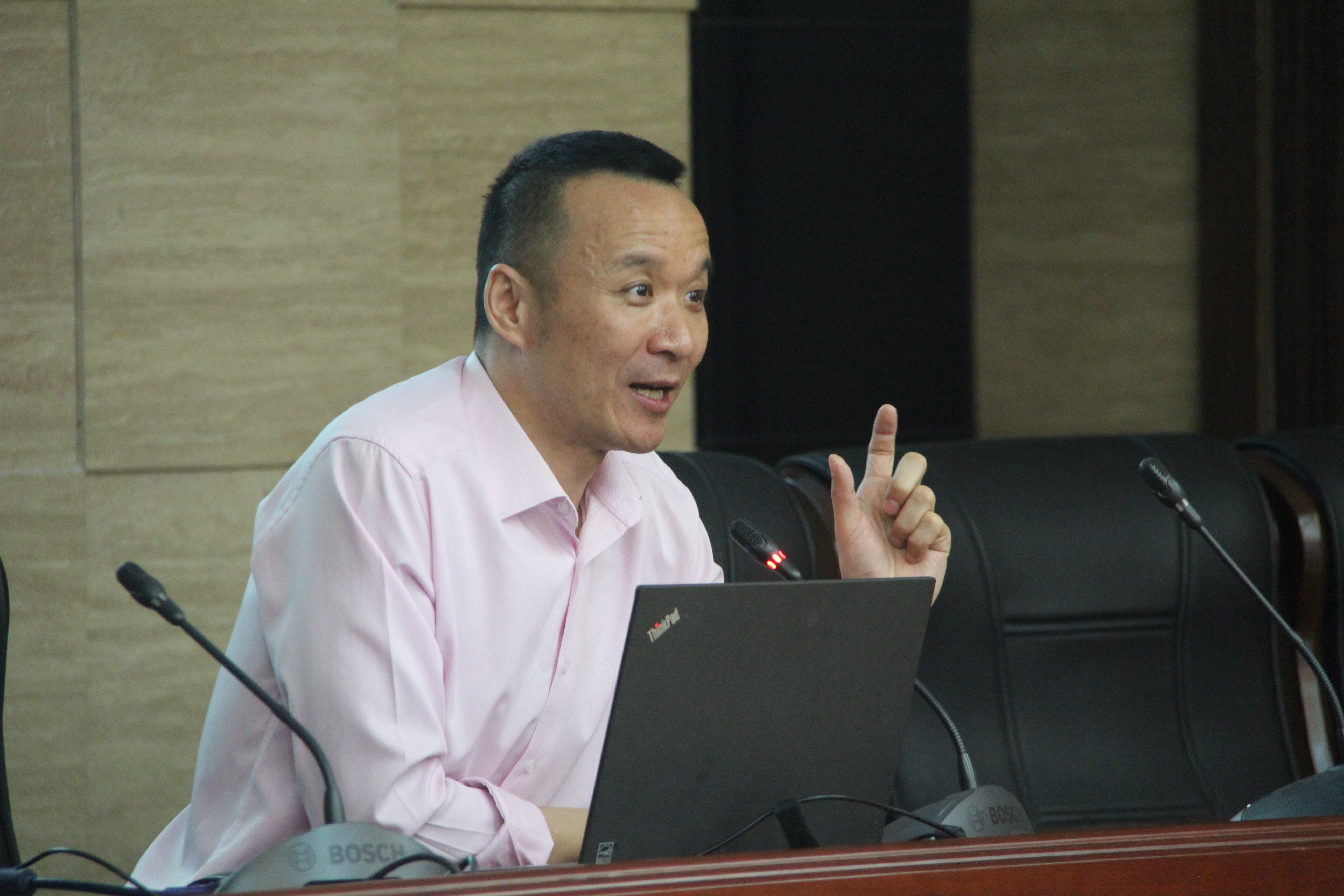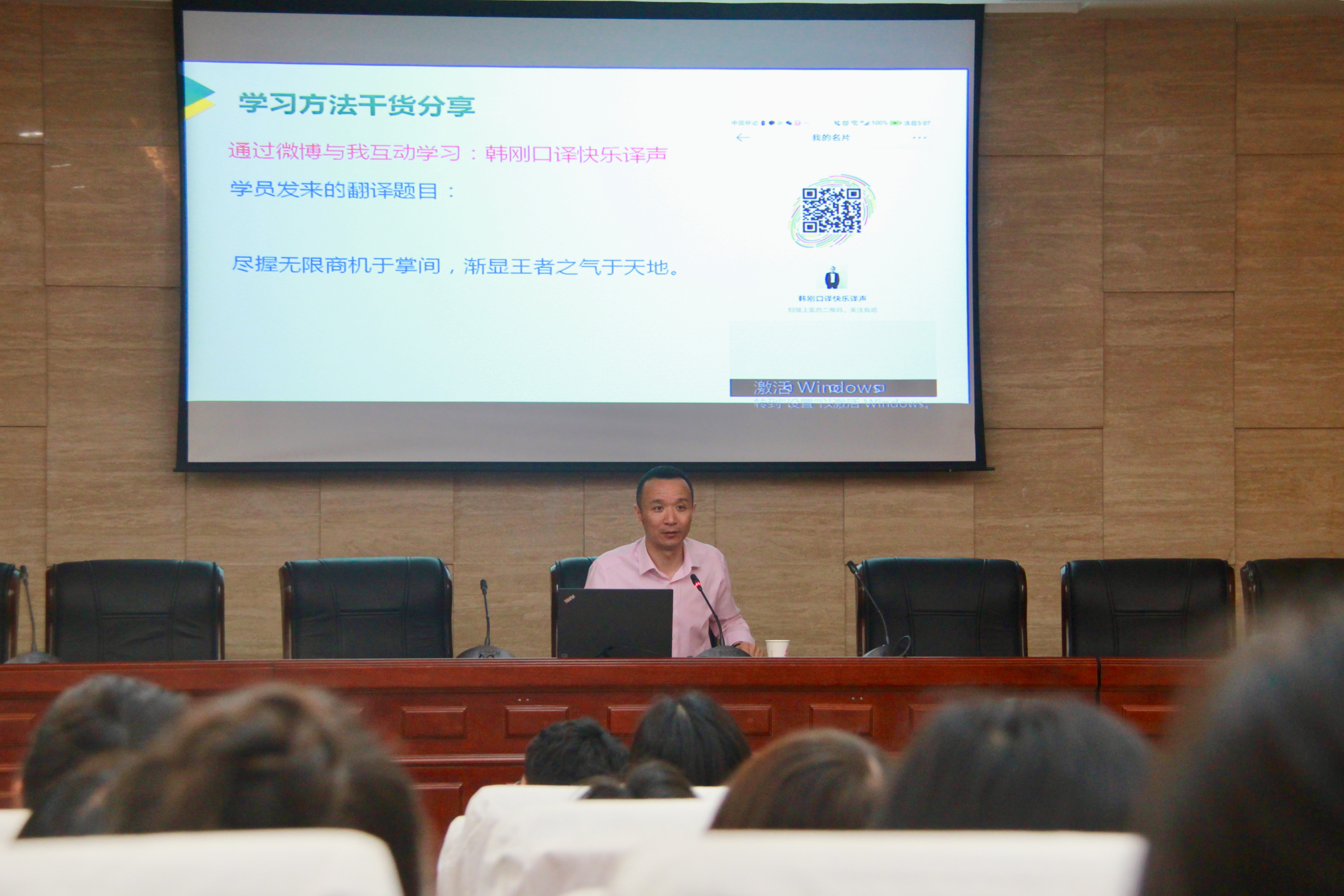本次讲座共分为学习方法分享、入行经验分享和互动问答三个环节,干货满满,精彩纷呈。首先韩刚老师结合多个最新口译案例,向大家介绍了颇为实用的学习方法,其讲解深入浅出,令在场师生受益匪浅。他强调,口译追求的是“简明英语”(plain English),因此在翻译学习和实践中全面吃透小词极为重要,译者也需不断留心积累,做到学以致用。之后,韩刚老师通过分享自己精彩的同传经历和丰富的教学经验,深入启发同学们的反思与定位。在互动环节,同学们纷纷提出疑问与困惑,包括职场翻译与外宣翻译的对策区别、口笔译的考级问题等,韩老师从自身经历逐渐启发引导,细致耐心地解答了同学们的问题。最后,参会师生进行合影留念,共庆韩刚老师在十三水在线 巡讲之行圆满成功。