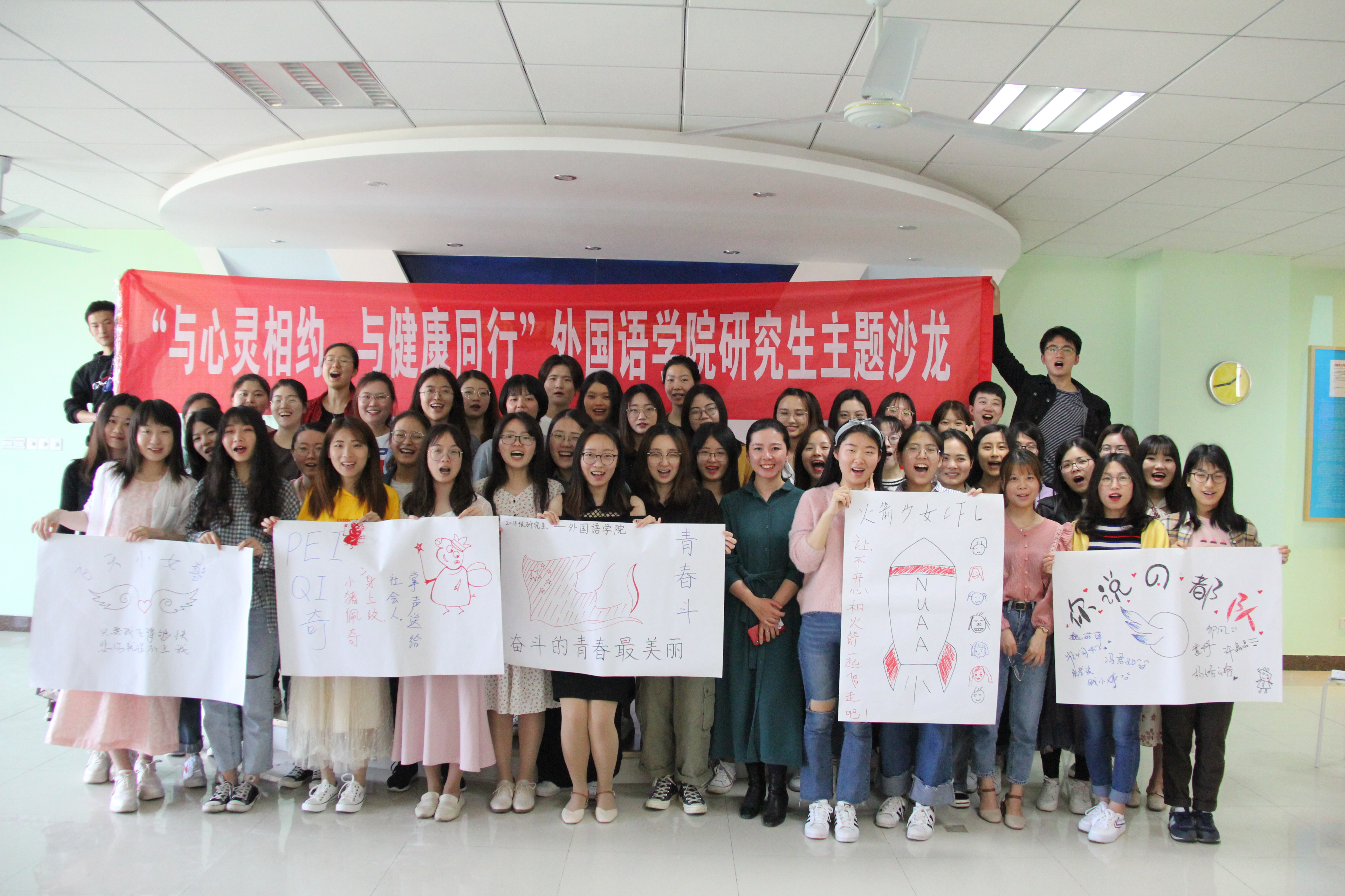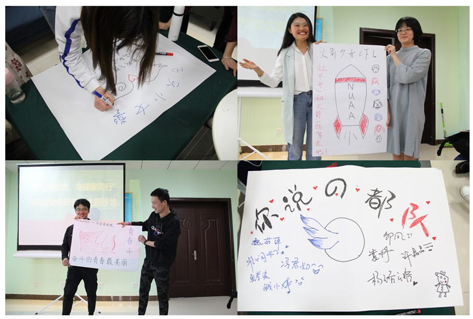 活动伊始,关天茹结合工作经历就春季来临,研究生易产生失眠、焦虑等心理问题作了知识普及和问题处理建议。随后,以团建形式开展阳光心理主题沙龙,现场同学随机分为5个团队,围绕阳光心理、青春活泼主题,每个团队在规定时间内完成团队文化建设,并形成最终海报制作,最后由每个团队派一名代表展示团队文化。活动现场一片欢声笑语,同学们创意丰富并积极表达想法,各团队都展示了具有特色且充满正能量的作品,整个活动过程中大家都收获颇丰。最后,现场同学们共同观看了励志小视频集锦,激励研究生们充满斗志、阳光向上。