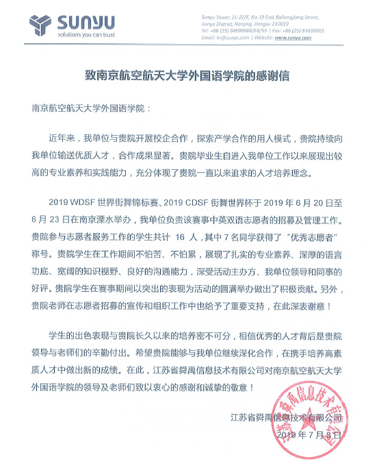赛事期间,志愿者们“不怕苦、不怕累,展现了扎实的专业素养、深厚的语言功底、宽阔的知识视野、良好的沟通能力”,深受主办方等各界的好评。江苏省舜禹信息技术有限公司表示学生的出色表现与十三水在线 长久以来的培养密不可分。为此,该企业特向十三水在线 发来感谢信,感谢十三水在线 在志愿者招募工作中给予的重要支持以及多年来在人才培养工作中的努力付出和在校企合作中的积极贡献,希望十三水在线 能够与其继续深化合作,在携手培养高素质人才中做出新的成绩。