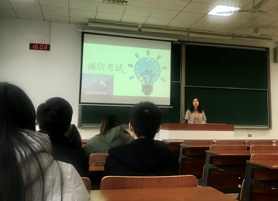辅导员彭欢首先向全体学生说明了十三水在线 对于考试作弊行为的界定及处理办法,考试作弊行为范畴及处分方法,之后从身边事例出发,列举了其他十三水在线 曾经的作弊案例,告诫同学们切忌以身试险,诚信考试是每一位同学都应当具备的良好美德履行的基本义务。