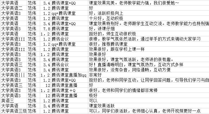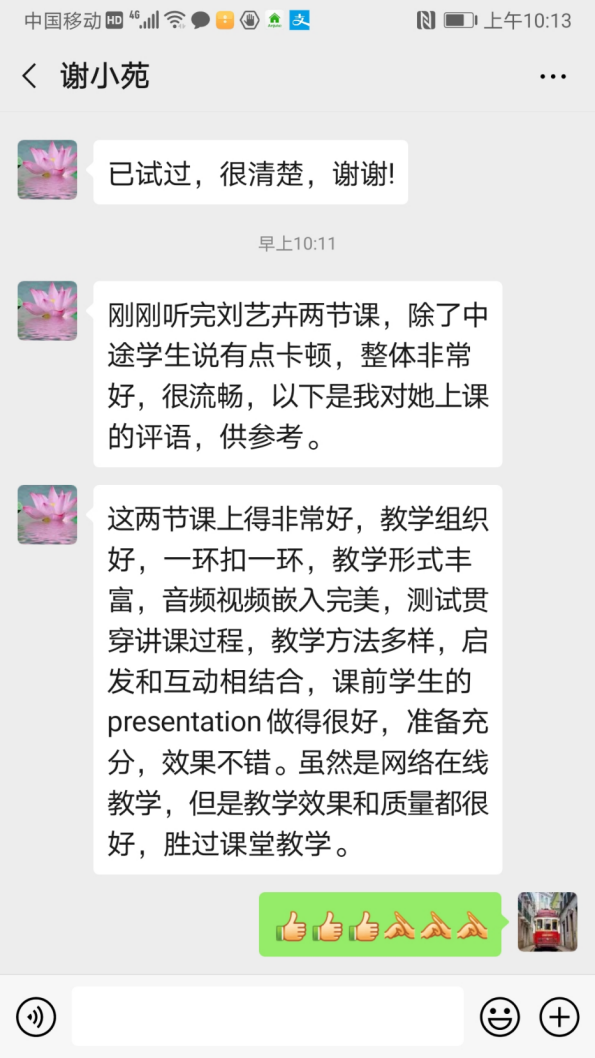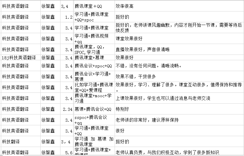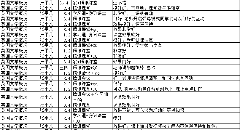 院教学办用小程序统一制定了在线教学学生反馈表,保证每人每门课程在开课第一周不同时段获得足够数量的教学评价和意见反馈,一旦发现某门课程需要改进就反馈给任课老师。院督导组抽查听取新教师课程并进行反馈,此外,很多任课老师也用自己的方式倾听学生意见。教学相长,得到反馈后,老师们会迅速调整,提升教学效果,比如有的老师改善了录音条件,有的老师购置了高级麦克风,有的老师加强对在线工具的操练……广大学生普遍认可特殊条件下的在线教学模式,毫不吝啬地对每一位任课老师给予了许多好评,有学生直呼“课堂效果完美”、“老师教学能力强,我们很爱她”、“继续保持就很棒!超喜欢Amanda!”而不少老师也表示乐意得到反馈意见,以便及时提高。