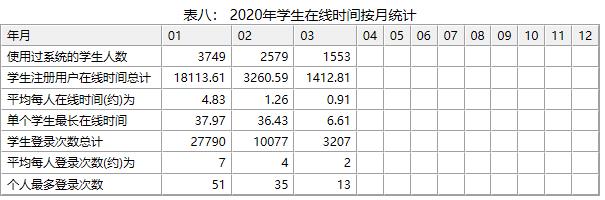首先是多管齐下,保证教学不卡顿。每门课程根据自身特点,选择合适的组合方式开展教学。基础必修课中,大学英语III依托腾讯课堂、外教社“新理念学习系统”以及清华出版社“新世界交互英语学习系统”开展线上教学;大学英语IV主要依托腾讯课堂、雨课堂以及外研社“新标准大学英语学习系统”开展线上教学。下图为2020年3月外研社“新标准大学英语”学习平台提供的数据。