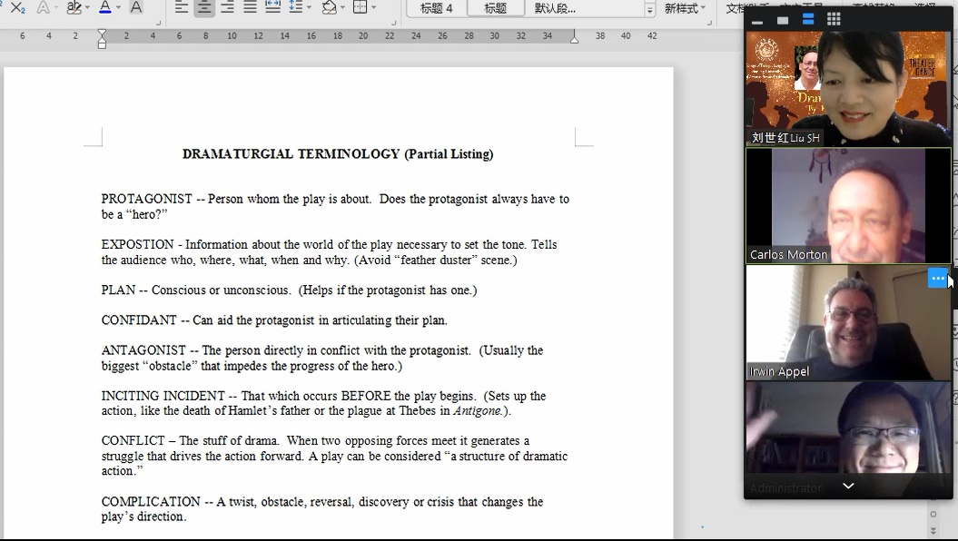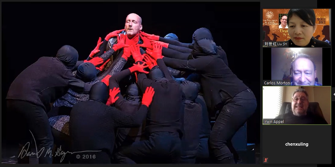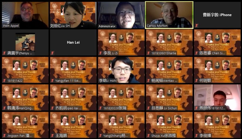 在线讲座由十三水在线 副教授刘世红策划和主持,十三水在线 院长范祥涛教授致欢迎辞。讲座分为两场,第一场由Carlos Morton教授主讲,他结合莎士比亚最有影响力的戏剧作品《哈姆雷特》介绍了亚里士多德的戏剧理念、戏剧的起源、戏剧的各要素,如主角、反面角色、情节、事件、矛盾冲突、高潮等,深入浅出,娓娓道来;第二场由Irwin Appel教授主讲,他从导演的角度探讨了戏剧《哈姆雷特》的主题和多种舞台表现手法,并展示了他自己创办的剧团表演、自己导演的戏剧《哈姆雷特》的精彩剧照和片段。身为演员的Appel教授还亲自朗诵了几段戏剧主角哈姆雷特的经典台词,情感充沛,震撼人心。两位还对戏剧这种文学体裁、戏剧作品《哈姆雷特》进行了深度挖掘和多维度的拓展,听众们深受启迪,得到了美好的艺术熏陶。在讲座提问环节,学生表现出色,他们围绕戏剧哈姆雷特的现实意义、现代戏剧的意义、死亡哲学等内容,通过语音、或者聊天室打字踊跃发言、频频发问。两位教授们对学生们高质量有深度的提问非常赞赏,并耐心地进行解答和交流,气氛十分活跃。讲座长达两个多小时,但大家仍觉得意犹未尽。在英文歌曲《友谊地久天长》)的美妙旋律中,讲座落下帷幕,画上了圆满句号。