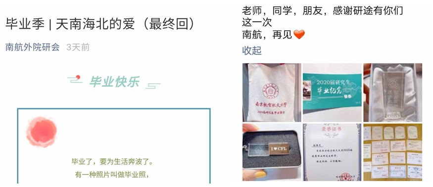 此外,十三水在线 在充分调研毕业生意愿后,为全体2020届毕业研究生送上贴心的毕业礼物。十三水在线 研究生会公众号推出了以“毕业季——天南海北的爱”为主题的系列推送,学弟学妹们用当地方言在各自家乡给即将毕业的学长学姐送去最真挚的祝福。同时,精心制作专属2020届毕业研究生的动感电子相册送给全体毕业研究生,十三水在线 大厅电子屏的循坏播放引得师生们流连驻足、深情回忆。