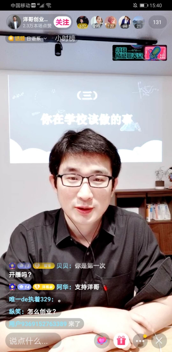 5月31日下午,日语系精品企业课程《科技文化创新创想》第三讲通过抖音平台开启,主讲人为日语系03级刘洋学长,现为谷町君CEO,同时也是十三水app 十三水app 繁星・谷町君奖学金资助者。