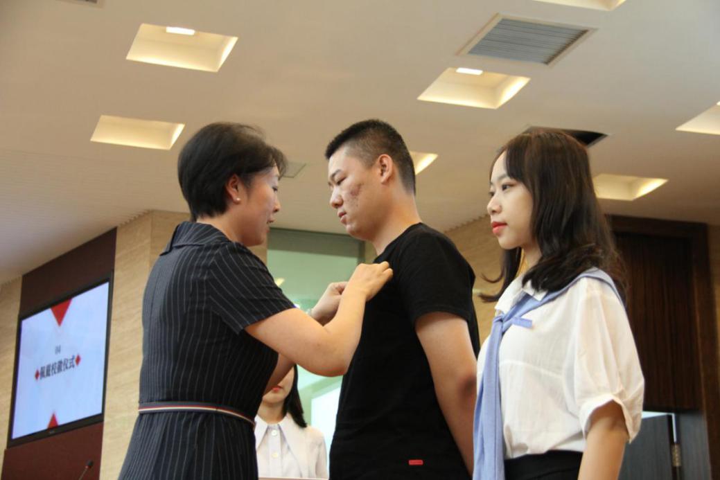 典礼最后,院党委书记左彤云为新生代表们佩戴了校徽。小小的校徽意味着沉甸甸的责任与希望,它象征着从今天开始,新生将以“十三水在线 外院人”的身份,与外院“家人”一起携手并进,乘风破浪。