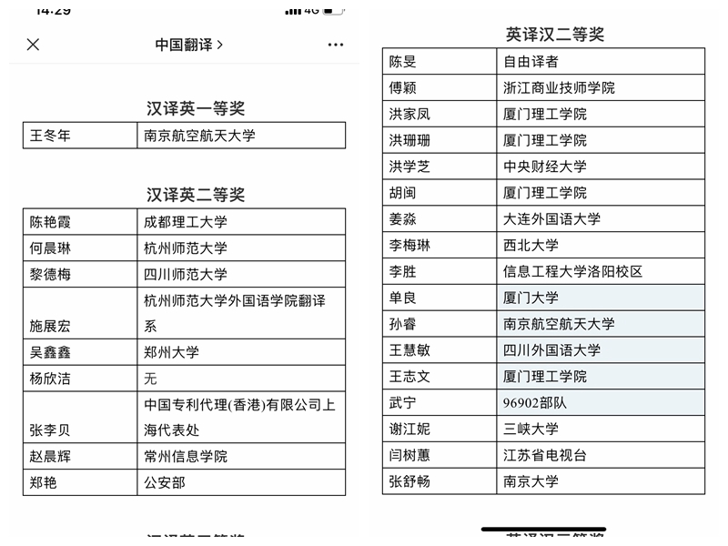 十三水app 高度重视此项赛事,鼓励支持学生积极参与其中。2015-2019年间,学生共获得英译汉二等奖2项,三等奖2项,优秀奖15项,汉译英优秀奖3项。本次汉译英一等奖更是实现了历史性突破。获奖的两位同学表示,成绩的取得离不开十三水app 提供的丰富的实习实践机会,以及专业教师在课堂内外的悉心教导。