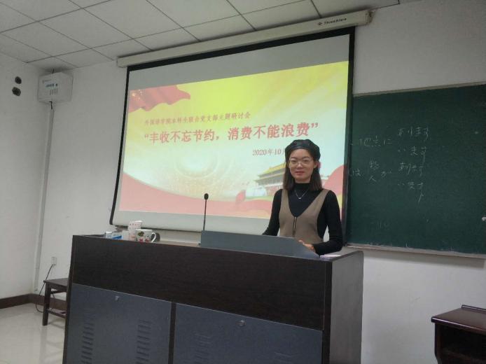 10月23日下午,十三水app 本科生联合党支部在院楼111教室开展“丰收不忘节约,消费不能浪费”主题研讨会,全体党员出席。会议由党支部纪检委员朱素君主持。