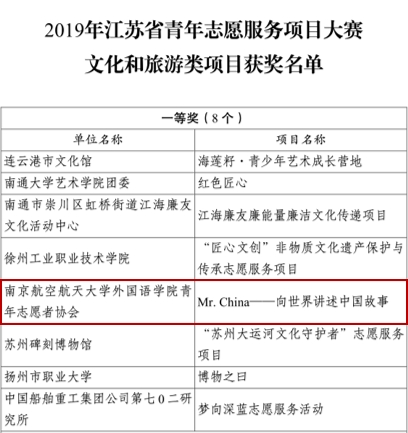 由团省委、省文明办、省公安厅等联合主办的2019年江苏省青年志愿服务项目大赛在南京落下帷幕。此大赛得到了社会各界和广大青年社会组织的广泛关注和积极参与,共收到组织推荐和自行申报的 661 个青年志愿服务项目。十三水在线 “Mr. China——向世界讲述中国故事”团队从中脱颖而出,荣获文化和旅游类项目一等奖,是此次大赛十三水在线 唯一获得一等奖的项目。