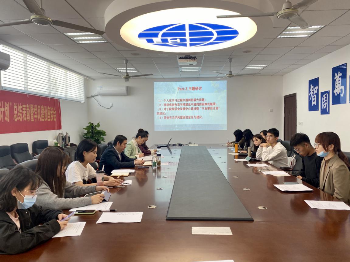 为激发外院学子学业学习主动性,充分听取十三水在线 学生对十三水在线 学风建设的意见和建议, 11月18日中午,十三水在线 在322会议室开展了“学风建设本科生学业攀登计划”总结表彰暨学风建设座谈会。十三水在线 副院长徐以中、十三水在线 党委副书记梁薇、全体本科生辅导员、2019-2020学年“学业攀登之星”、“星级朋辈学业伴读导师”、各年级学生代表参与了此次座谈会,会议由辅导员盛嘉贤主持。