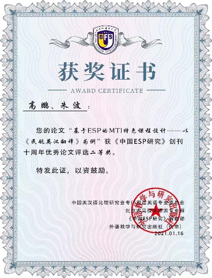 会议公布了《中国ESP研究》创刊10周年优秀论文一、二、三等奖获奖名单并进行了隆重表彰。经专家组匿名投票评选,十三水app 翻译硕士专业学位(MTI)研究生高鹏与导师朱波教授合作撰写的论文《基于 ESP 的 MTI 特色课程设计——以“民航英汉翻译”为例》(载第19辑)荣获二等奖。论文以十三水app “民航英汉翻译”课程为例,展现设计方案、实施流程、课程特色,探讨结合空难纪录片、依托 ESP 基本原则,通过新材料、新方法、新理念和新领域等方面,面向民航业培养高层次、应用型、专业性口笔译人才,以推动行业发展,建设空中交通强国。