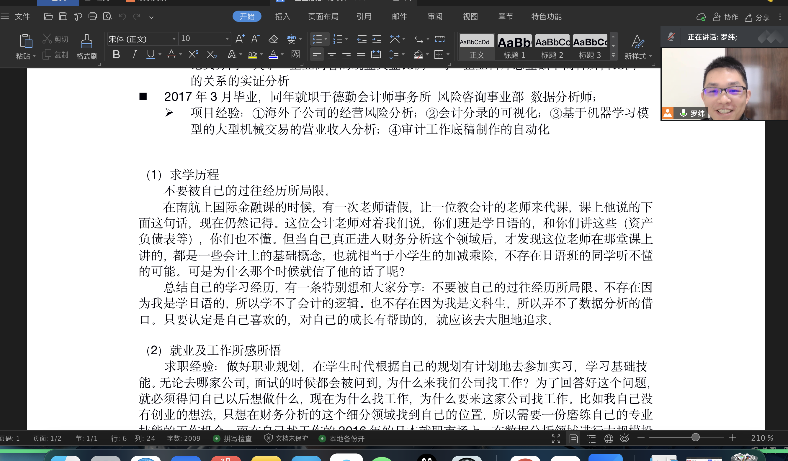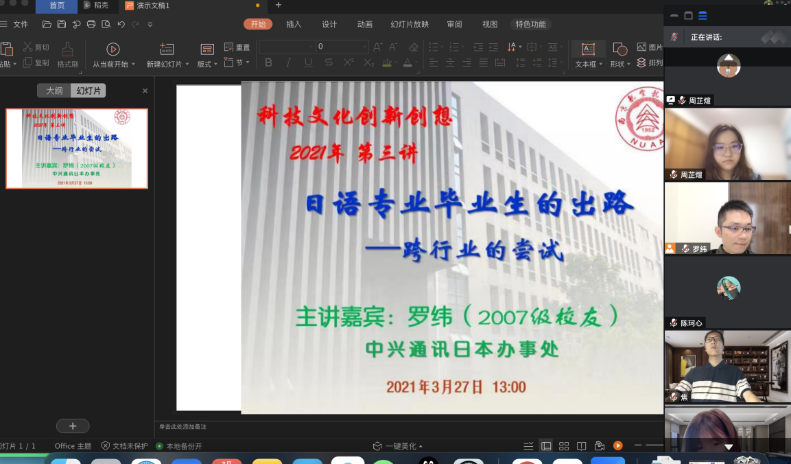 3月27日下午1:00,十三水app 日语系科技文化创新创想课程第三讲通过腾讯会议模式开启,主题为《日语毕业生的出路——跨行业的尝试》,主讲人为07级日语系校友罗纬,日本一桥大学和东京大学双硕士,曾就职于日本德勤会计师事务所,任职风险咨询事业部数据分析师,现就职于中兴通讯日本办事处。