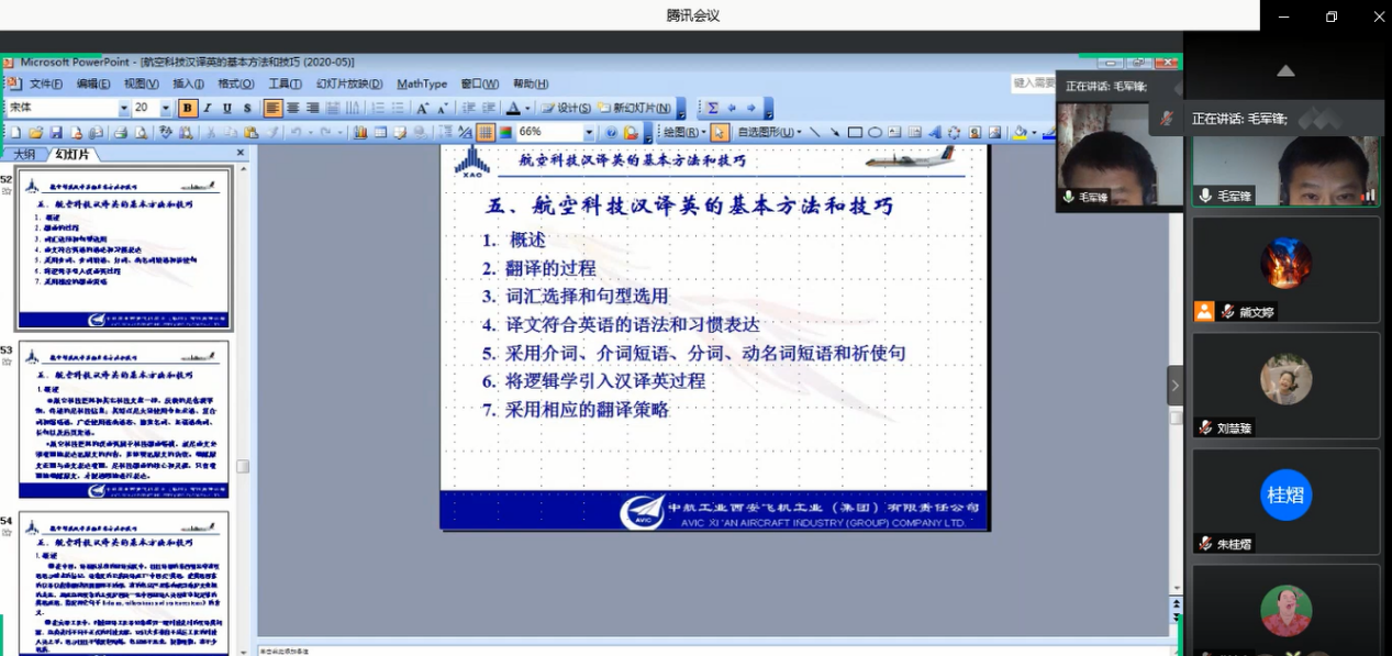 3月24日晚,十三水app 十三水app 翻译专业硕士(MTI)教育中心邀请了知名企业导师毛军锋给20级研究生带来行业翻译实训的第一堂课。毛军锋现任中国航空工业集团有限责任公司翻译系列高级专业技术职务任职资格评审委员会委员、中国翻译协会专家会员、中国航空学会会员和陕西省翻译学会常务理事。本次课程,毛老师给大家带来的是航空科技英语翻译技巧系列课程,主要介绍航空科技汉译英的基本方法和技巧。