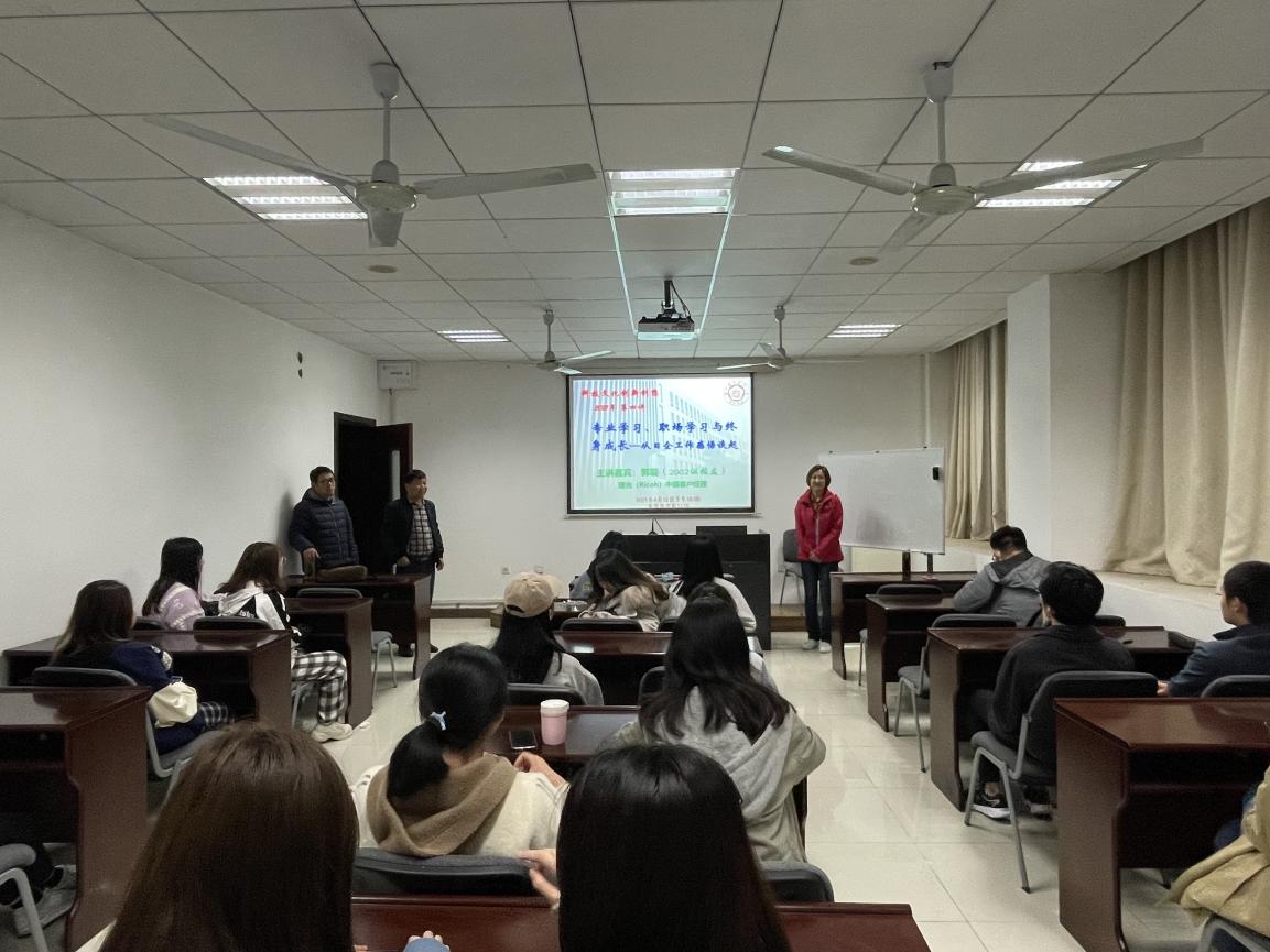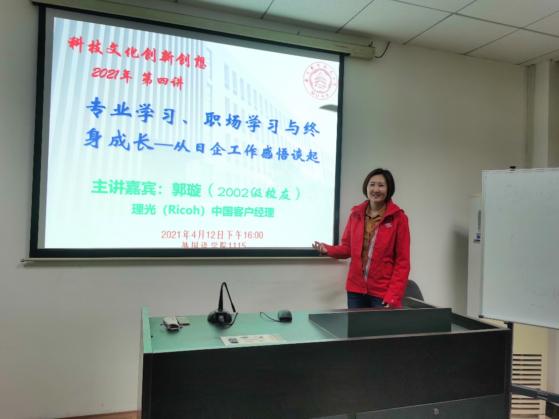 4月12日下午4:00,十三水app 日语系科技文化创新创新课程第四讲在十三水app 1115教室成功举办,主题为《专业学习、职场学习与终身成长——从日企工作感悟谈起》。主讲嘉宾为02级日语系校友郭璇,现任理光(Ricoh)中国客户经理。