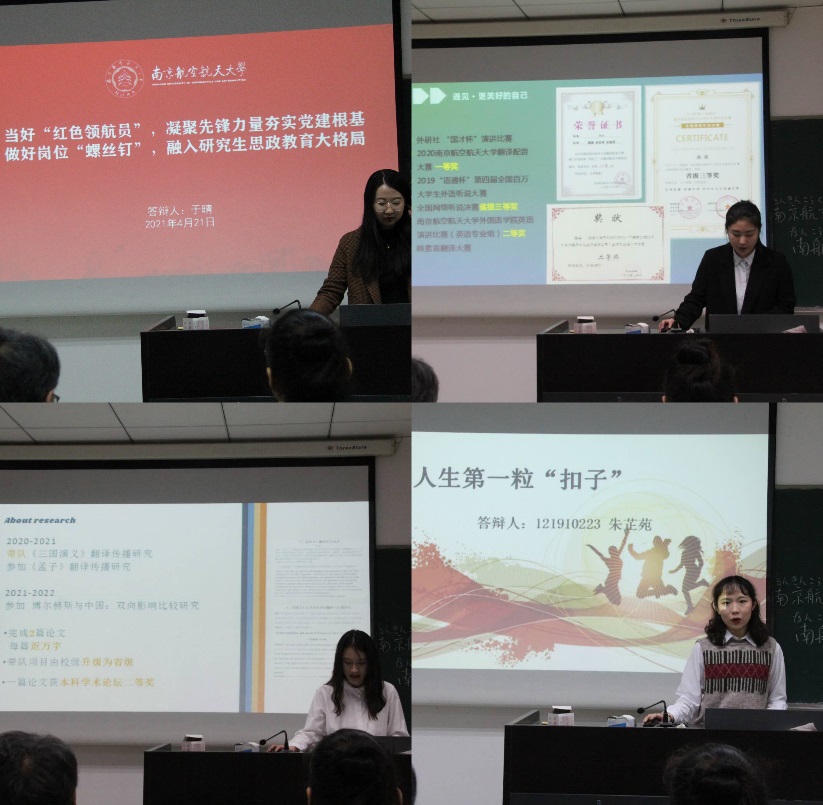 在主持人的介绍下,答辩选手们依次上台分享自己的青春故事。20级研究生于晴根据亲身经历,号召作为当代青年应该当好“红色领航员”,做好岗位“螺丝钉”;19级本科生魏嘉在爷爷的言传身教下,牢记初心与使命,为成为一名合格的共产党员而奋斗;19级本科生朱芷苑分享了自己扣好人生第一粒“扣子”的故事,响亮地回答了“青年何为”的问题;19级本科生徐笑云讲述自己从“利己主义的囚徒”转变为“洒脱真诚的生活者”的过程,提出用真诚与热忱面对生活;18级本科生刘怡君在学习生活中不断突破自我,分享自己学习英语的经历,身体力行地争做笃学青年;18级本科生胡嘉玥就“青年担当”展开叙述,体现了新时代新青年强烈的使命感与责任感;18级本科生郑怡把成为一名口译官当做自己的梦想,提出执着于理想,纯粹于当下;19级研究生尹思梦用简单朴实却切实有力的话语,告诉大家勤能补拙,要为理想不懈奋斗。选手们自信从容,落落大方,从小我出发,分享青春,心怀家国,展现了外院学子的青春风采。