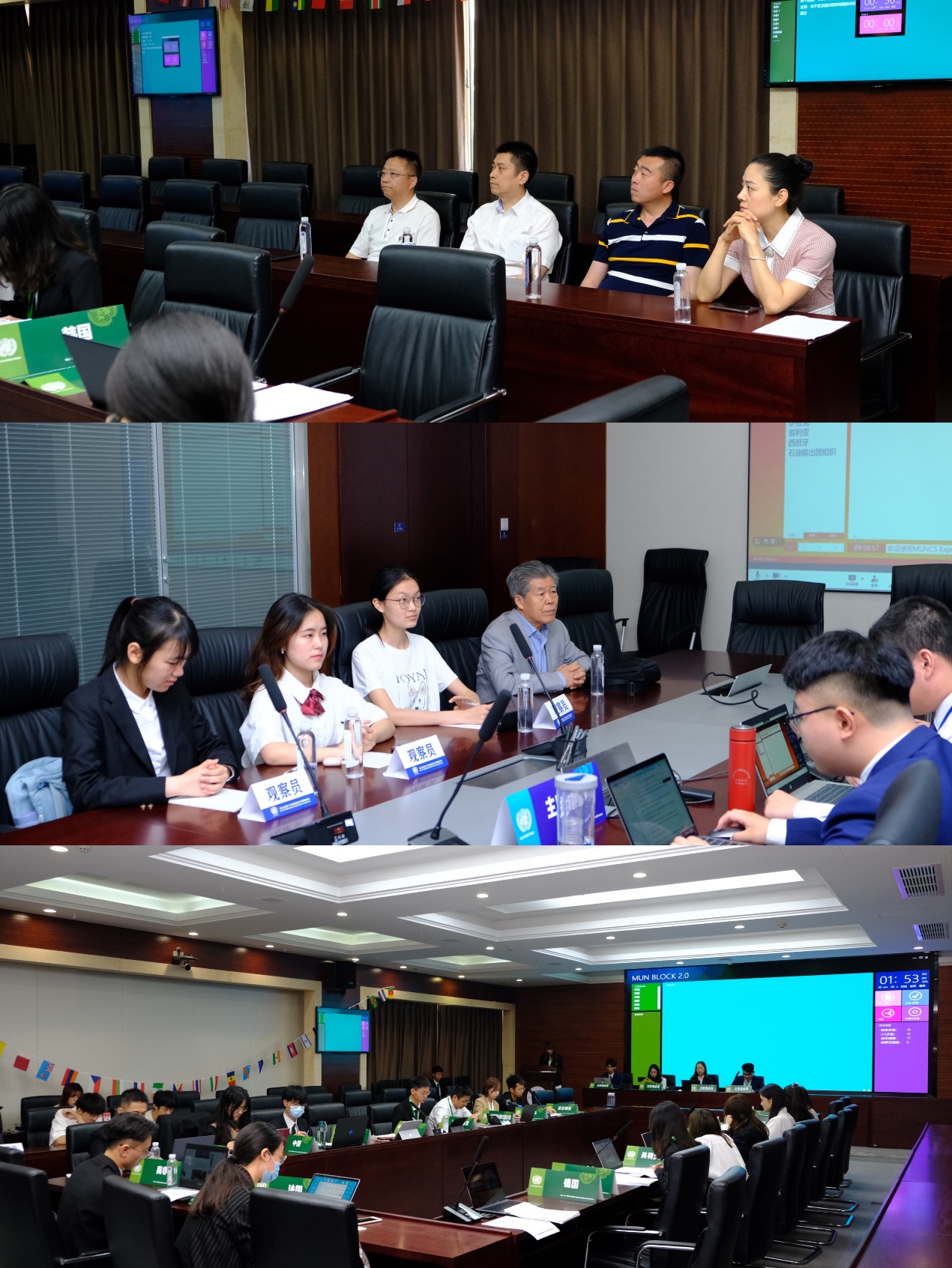 本次大会下设“1991中东和平会议”、“贸易争端的管控——构建多边主义与经济全球化”两大线上会场,以及“后疫情时代公共卫生应急机制及发展前景”线下会场,线上会场代表通过腾讯会议参会。会场氛围热烈,代表们在从不同的国家视角看世界、谈对策的实践中开拓了国际视野。高有祯听取了历史特色委员会“1991中东和平会议”的讨论情况,为会议代表们提出了宝贵的意见;唐建明则深入世界卫生组织执行委员会,观摩了现场会议情况。