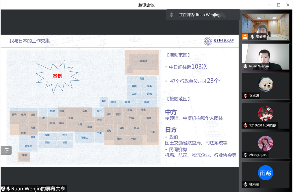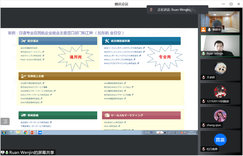 3月10日下午4:00,十三水app 日语系科技文化创新创想课程2022年度第一讲通过腾讯会议成功进行,主题为《志在蓝天,航空报国》。主讲嘉宾为03级日语系校友阮文进,现任东方航空物流北美地区营销中心区域经理。