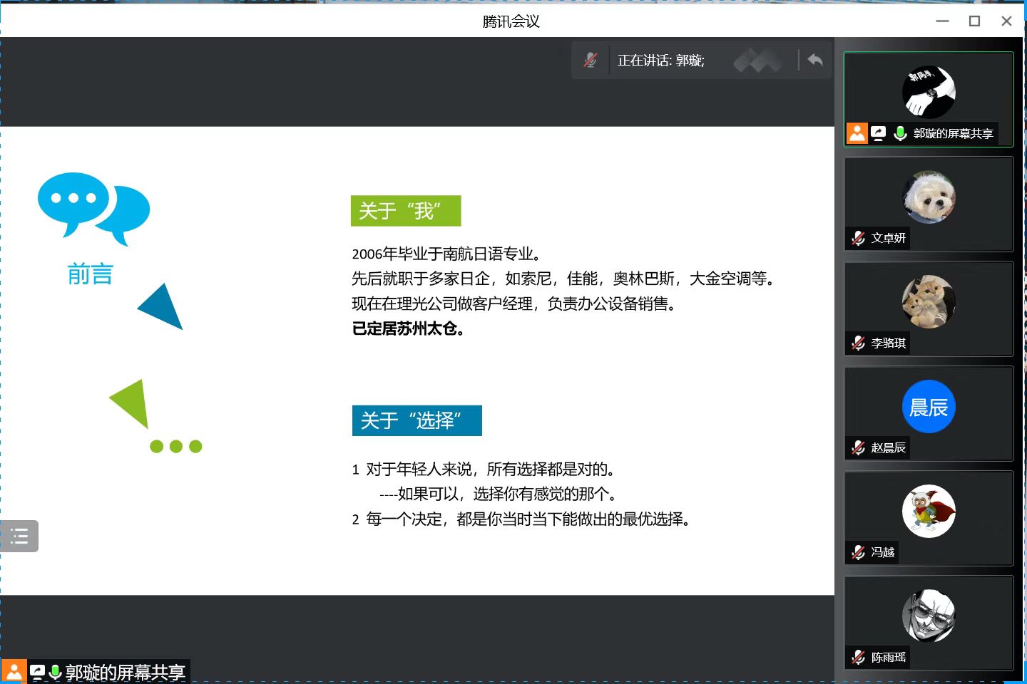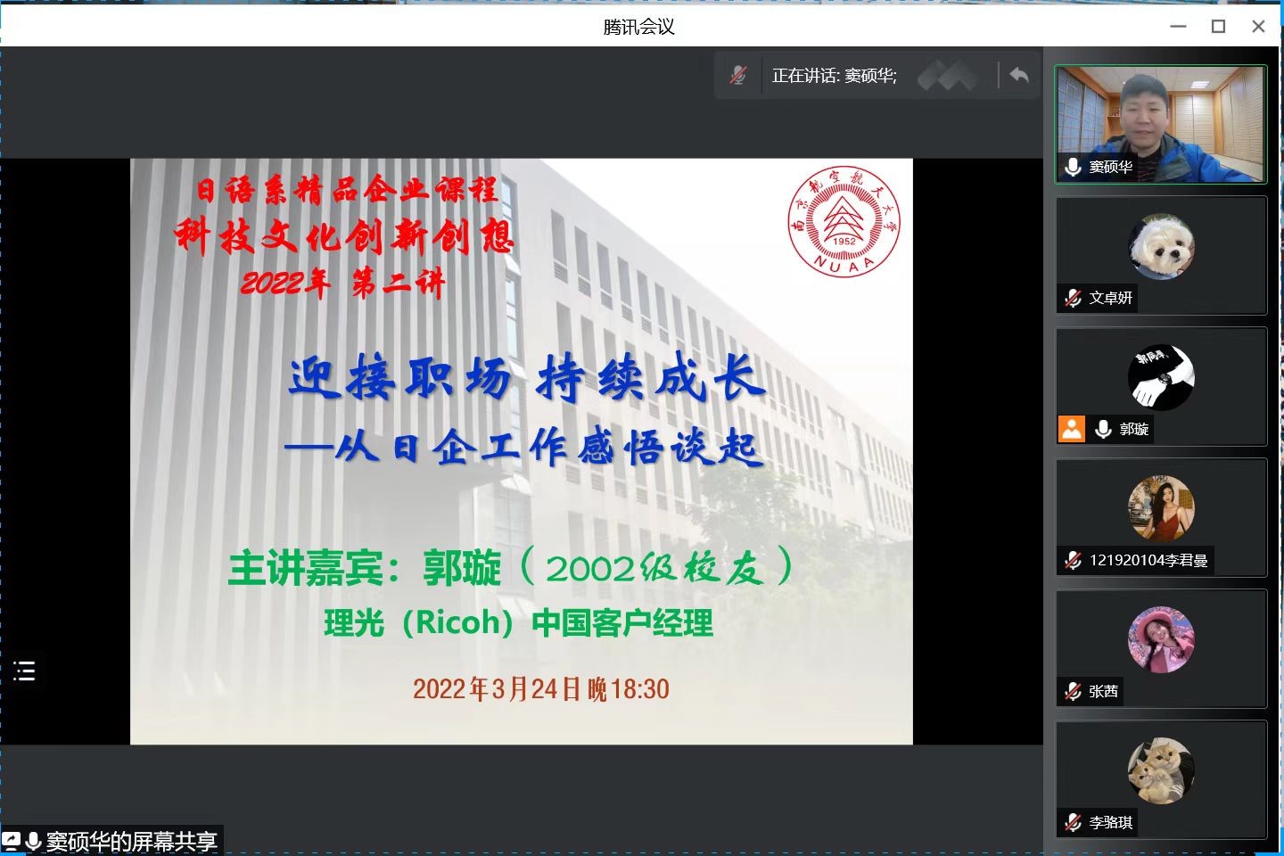 3月24日下午6:30,十三水app 日语系科技文化创新创想课程2022年度第二讲通过腾讯会议成功进行,主题为《迎接职场,持续成长——从日企工作感悟谈起》。主讲嘉宾为日语系02级校友郭璇,现任理光(Ricoh)中国客户经理。