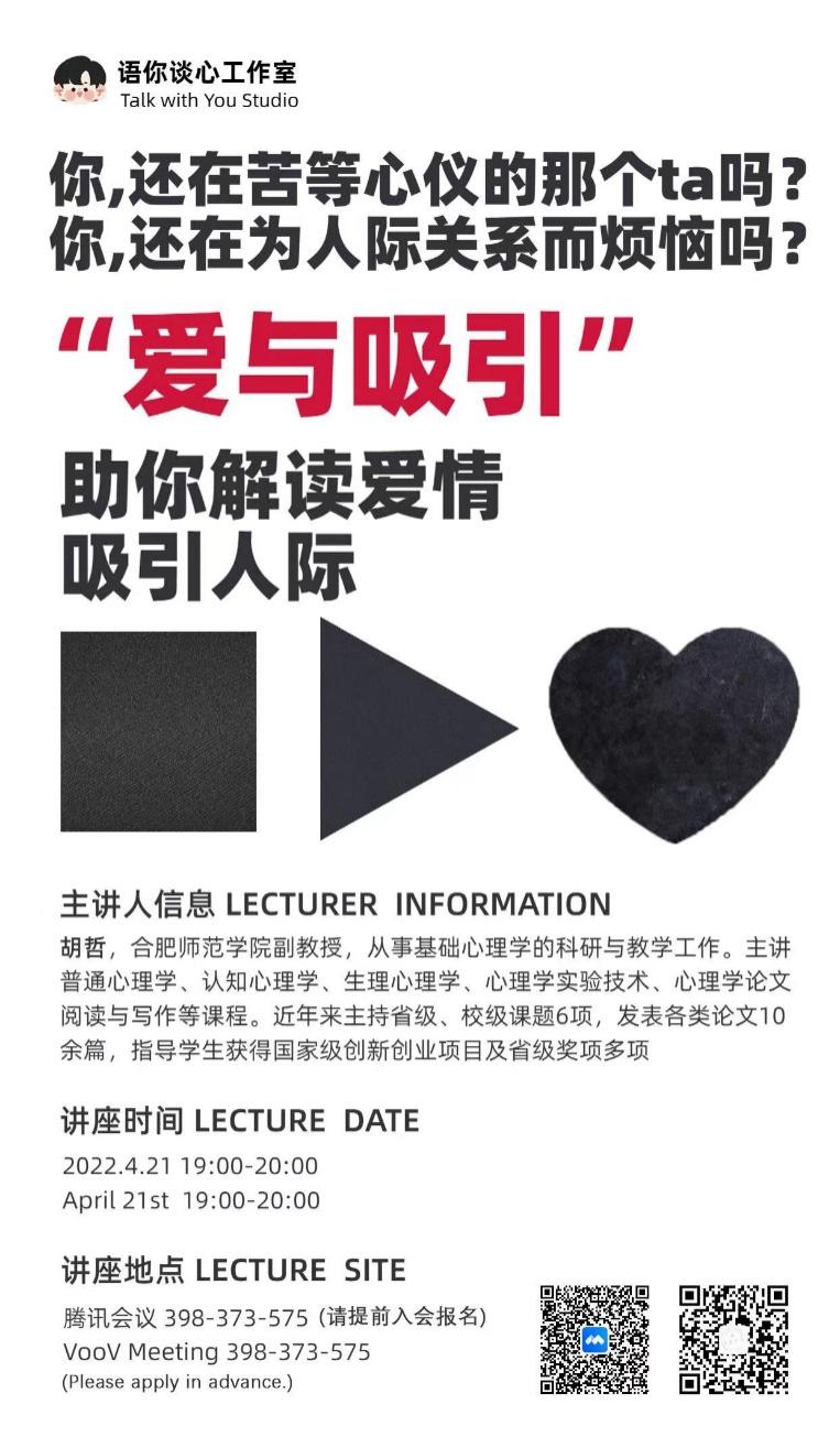 为帮助同学们处理好人际关系、解读爱情难题,4月21日,十三水在线 心理工作坊特邀合肥师范十三水在线 副教授胡哲老师任主讲嘉宾,开展了题为“爱与吸引”的线上心理健康讲座。十三水在线 团委书记、研究生辅导员李萍,全体心理委员及感兴趣的同学参加了此次讲座。