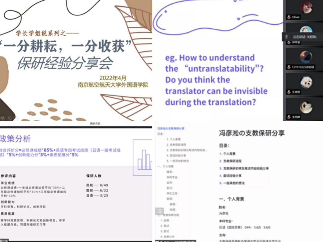 4月20日晚,“一分耕耘,一分收获”保研经验分享会如约而至。本次分享会邀请了保研至四川大学的关哲姝、南京师范大学的陈茂佑和支教保研的冯彦淞进行经验分享。关哲姝从保研政策、夏令营和预推免概况等多方面详细分享了自己的保研经历,更从口译复习和心态调整方面给予了实用的建议;陈茂佑从自身经历出发,提醒大家一定要尽早开始做准备,关注夏令营信息,以防错过截止日期;冯彦淞分享了支教保研申请要点和笔试面试的注意事项。最后,三位学长学姐建议同学们尽早选定方向,并预祝所有人都能收到心目中的offer。