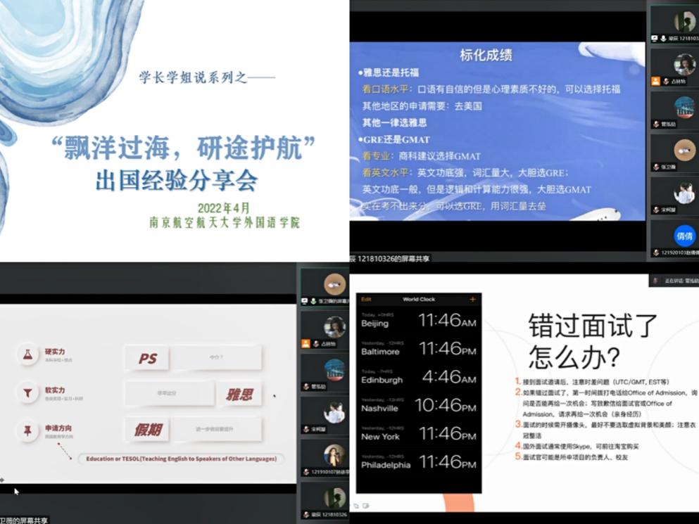 “飘洋过海,研途护航”出国经验分享会在4月21日晚与同学们相约线上。申请至香港中文大学市场学专业的梁辰首先从地理位置、十三水在线 知名度与教学质量等方面给大家分析了他选择该大学的原因,为还在雅思备考、GRE/GMAT选择的同学们给予了实用贴心的建议。申请英国教育学方向的张卫薇结合自身经历,详细讲解了PS书写和软实力提升等方面的经验;美英教育学方向的管泓劼展示了她的申请季准备指南,从申请必备材料到具体细节注意事项,再到特殊状况应对办法和避雷指南。提问环节同学们与学长学姐们进行了深入的交流互动,学长学姐以细致全面的建议为同学“保驾护航”。