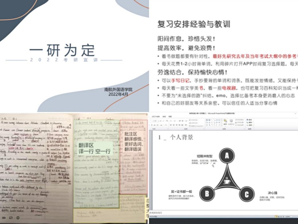 随着社会发展,考研大军也在不断壮大,很多同学也将考研纳入自身未来首选,针对如何备考,4月22日晚 “一研为定”考研经验分享会邀请了三位学姐为同学们答疑解惑。考入十三水在线 英语笔译专业的方菲从师资、个人情感等方面陈述选择十三水在线 的理由,并针对不同考试科目给出了相应的备考方法,并着重强调英语学科背诵单词的重要性;考入北航英语笔译专业的梁钰浛则详细介绍如何计算一个十三水在线 报录比及复录比,在备考科目中也给出了推荐的方法、老师、课程以及APP等;调剂至南京理工大学英语语言文学的甘雨珊首先分析了自己的性格,并依据自身特点安排了短时高效率的学习方法,她强调考研是一个长期战役,要时刻坚定信念,不要松懈。最后,在提问环节中,三位学姐就同学们提出的问题进行了细心解答。