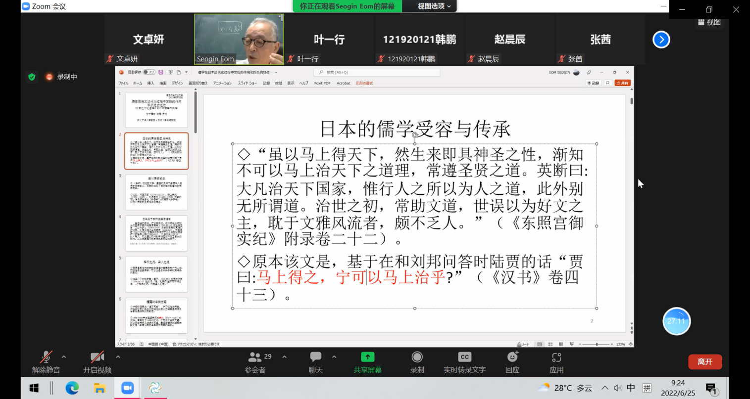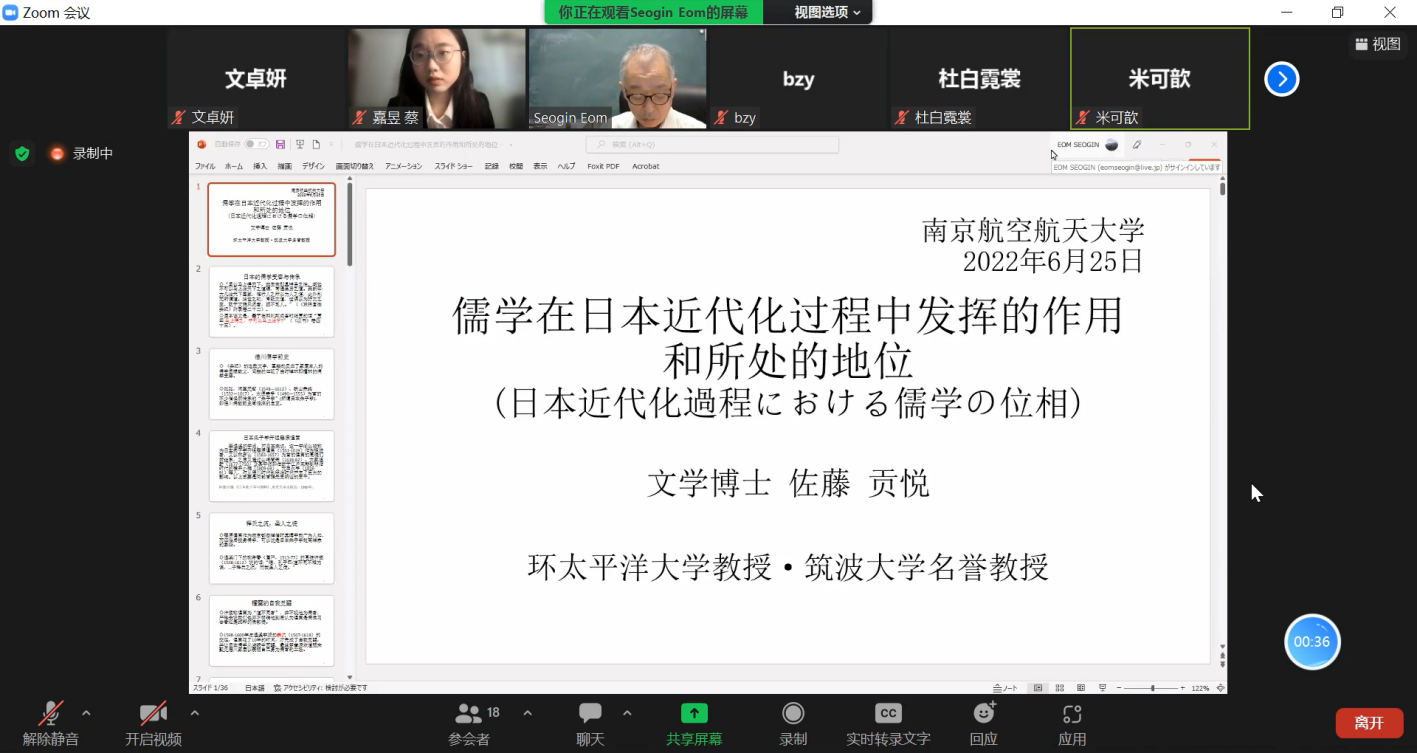 6月28日(周六)上午9:00,十三水app 日语系海外名师讲坛第二讲通过线上ZOOM会议成功进行,主题为《儒学在日本近代化过程中的作用》。主讲嘉宾为环太平洋大学教授・筑波大学名誉教授佐藤贡悦。