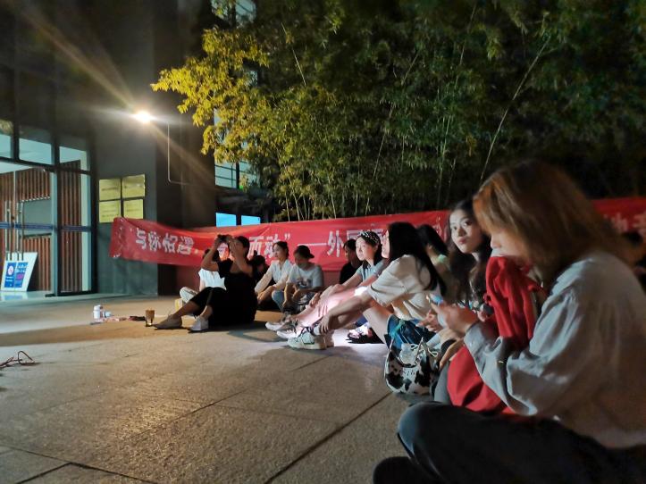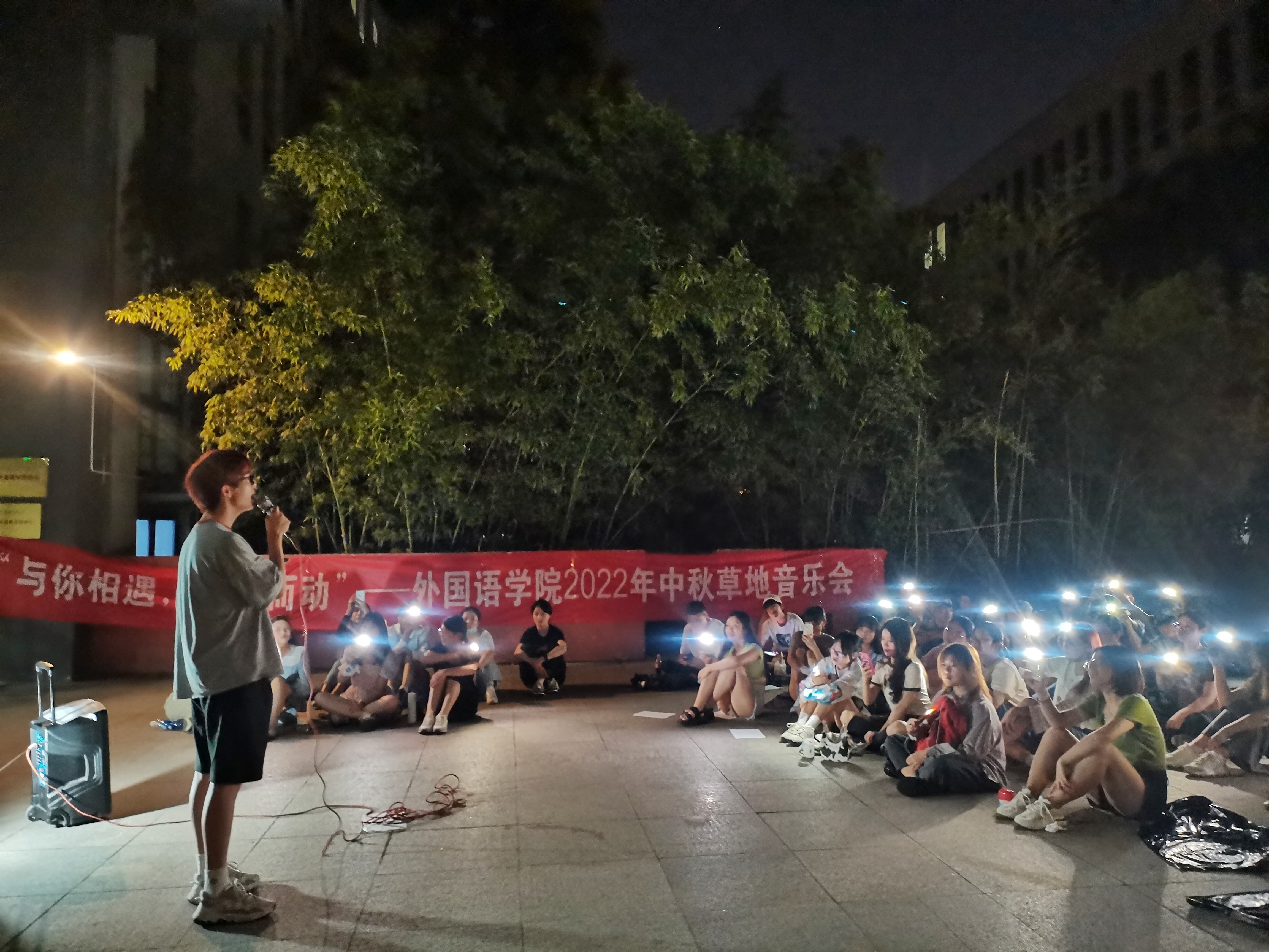 游戏热场完毕后,便是大家期待的自由KTV环节。活动进行到这里,同学们已经不再拘束,纷纷主动上台演唱,台下的同学自发打开灯光应援,一起合唱。现场气氛十分热闹,歌曲一首接一首,在青春的旋律中一起享受宜人的晚风,在歌声中畅想未来、寄托中秋祝福。