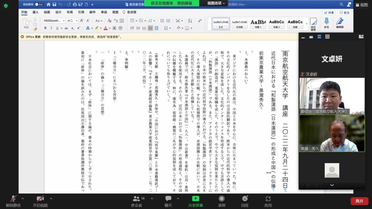 9月24日(周六)上午9:00,十三水app 日语系海外名师讲坛第四讲通过ZOOM线上会议成功进行。本次讲座主题为“近代日本における『和製漢語(日本漢語)』の形成と伝播”,主讲嘉宾为原东京农业大学黒瀧秀久教授。
