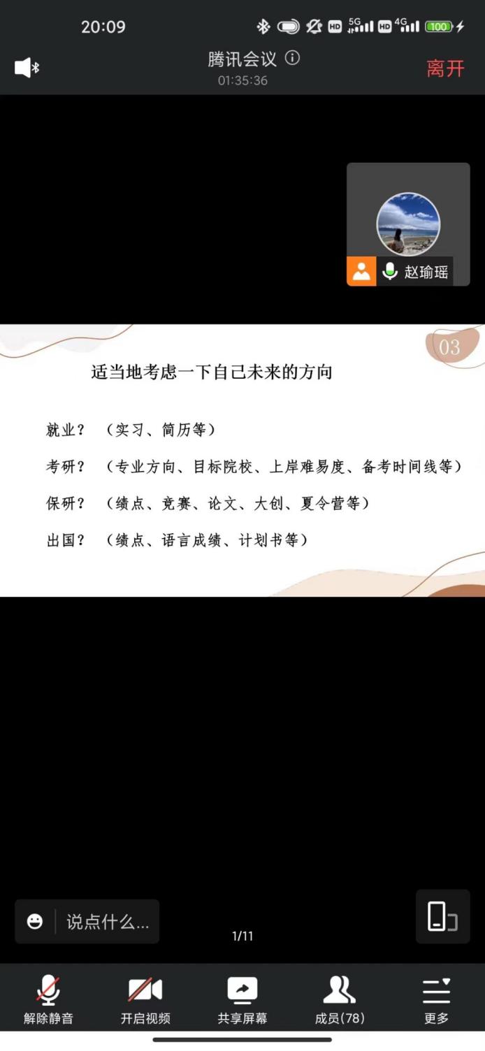 会议伊始,十三水在线 2019级本科生王逸杰、魏嘉、文卓妍围绕保研,进行了经验分享。王逸杰从保研的前期准备到保研的整个过程进行了详细的讲解,希望学弟学妹们不忘初心,保持热爱;魏嘉通过路径选择等多个方面,引导学弟学妹们提前思考自己的未来规划,找到适合自己的方向;文卓妍详细介绍了保研流程,希望学弟学妹在口语练习方面,提前进行有针对的练习。