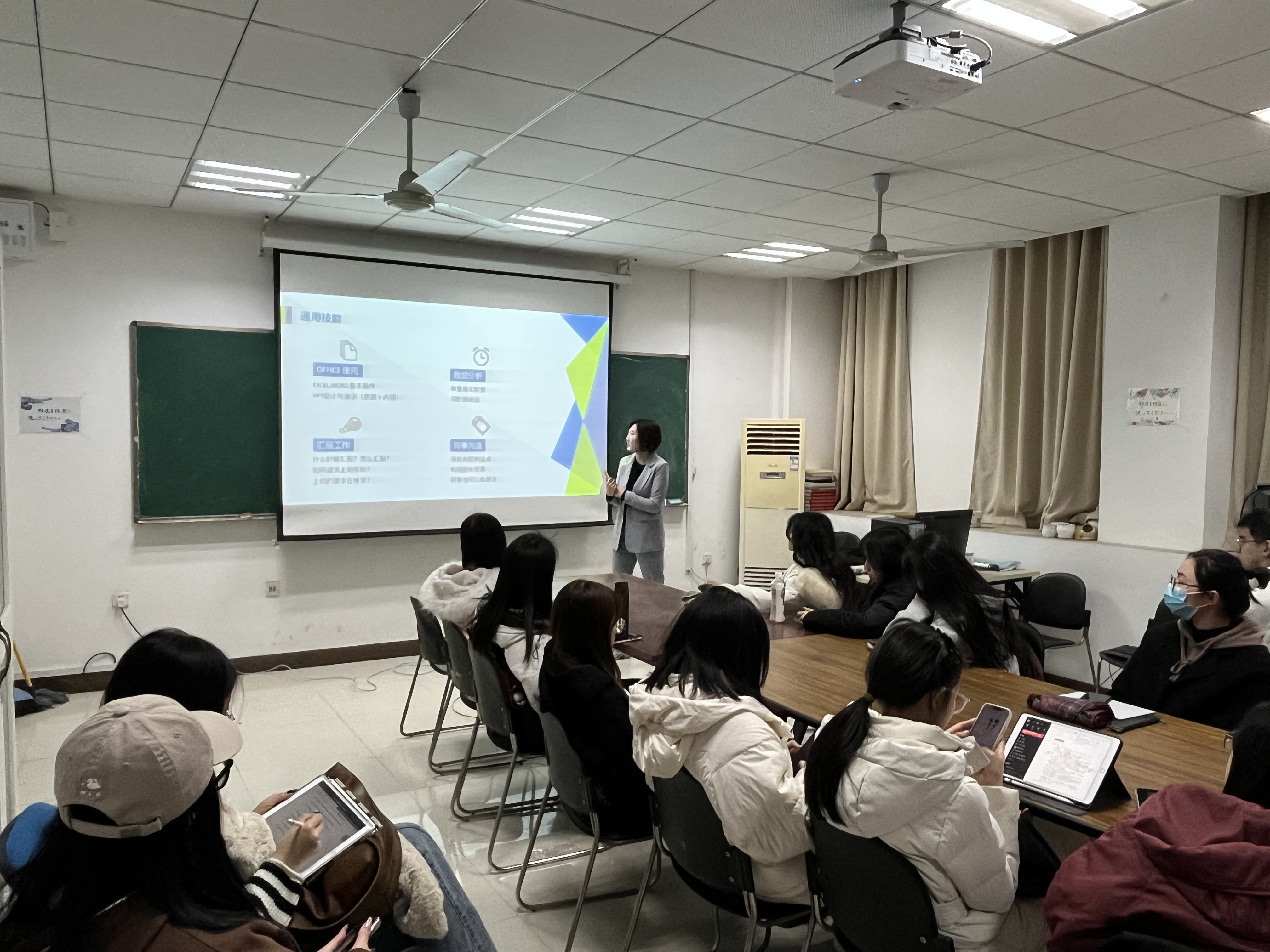 郭璇经理围绕“择业”、“入职”、“日企的工作模式”、“终身成长”这四个方面的内容与同学们进行了细致的经验分享。她建议同学们在择业之前,应当从“性格”、“爱好”、“优势”、“梦想”四个方面进行自我剖析,挖掘真实的自己,在锤炼中获得成长。其次,她细心地为同学们总结了四点工作通用技能,即office的使用、数据分析、工作汇报以及同事沟通。同时结合自身实例,以“干货”的形式为同学们的职业技能提升进行了点拨。