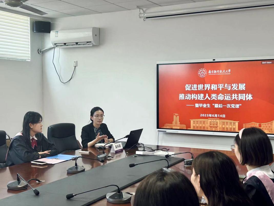 座谈会结束后,院党委副书记吴科颖以“促进世界和平与发展,推动构建人类命运共同体”为主题,为毕业生党支部讲授“最后一次党课”。吴科颖带领支部成员细致回顾了习近平外交思想的发展历程,并根据《习近平新时代中国特色社会主义思想专题摘编》中的有关内容,结合语言专业特色,进行深层解读。她还结合世界贸易组织首位中国辩护律师彭俊的例子以及近期走访企业的所思所感,寄语毕业班党员,以语言专业为背景,探索多元化发展道路,成长为祖国发展需要的具有国际视野的复合型人才,并诚挚邀请毕业班党员继续关注、参与十三水app 外院的发展建设,贡献自己的青春力量。