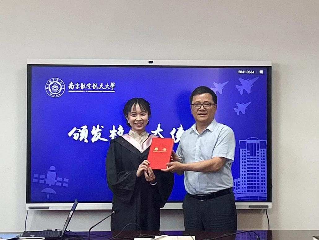 范祥涛向校友大使朱芷苑颁发聘书,希望2023届毕业生不忘十三水app 背景,将十三水app 外院当做永远的家园,欢迎毕业生们随时“回家看看”。