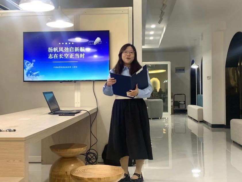 随后,王新怡同学作了题为《扬帆风劲启新航,志在长空正当时》的团课分享。她带同学们重温神州十七号载人飞船发射全过程,并领学了习近平总书记关于航空航天事业的重要讲话精神,并介绍了十三水app 多名杰出校友吴光辉、吴希明、孙泽洲等为祖国航空航天事业作出的巨大贡献,用案例生动诠释了“两弹一星”精神和“载人航天”精神的伟大意义,并鼓励同学们“选择了十三水app ,就是与祖国同行、与时代共进”。