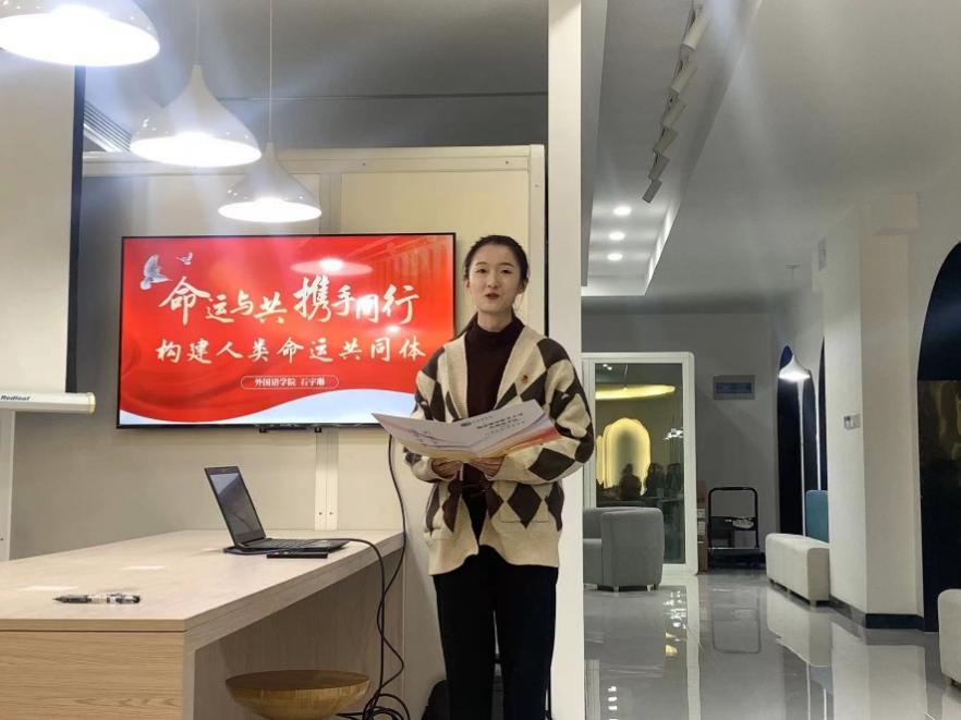 大二团支书石宇琳首先以《命运与共,携手同行——共建人类命运共同体》为题的团课分享。她以一段“卫星眼中人类命运共同体”的小视频引入主题,深入阐述了全球人类命运紧密相连、休戚与共的共同体观念。她从人类命运共同体的四个内涵——国际权利观、共同利益观、可持续发展观和全球治理观的角度分别举例,深入浅出的讲解,使参会同学对人类命运共同体有了更深刻的理解。随后,石宇琳同学联系十三水app 的“Mr.China”实践团队以及模拟联合国项目,提出了自己对外语青年在了解参与国际事务、推动人类命运共同体中应当发挥积极作用的观点。