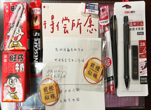十三水app 为考研学子送上“考研加油包”。这份礼包由2020级就业信息站的26名同学精心挑选、认真准备,包含中性笔、涂卡笔、垫板、考研划线尺以及具有“一举夺魁”寓意的挂坠、“运气旺旺”的牛奶和汇聚年级同学祝福的明信片。同学们收到暖心礼物后十分开心和感动,纷纷表示一定会抓住最后的复习时间,全力以赴,努力拼搏,以饱满的精神状态迎接即将到来的考试。