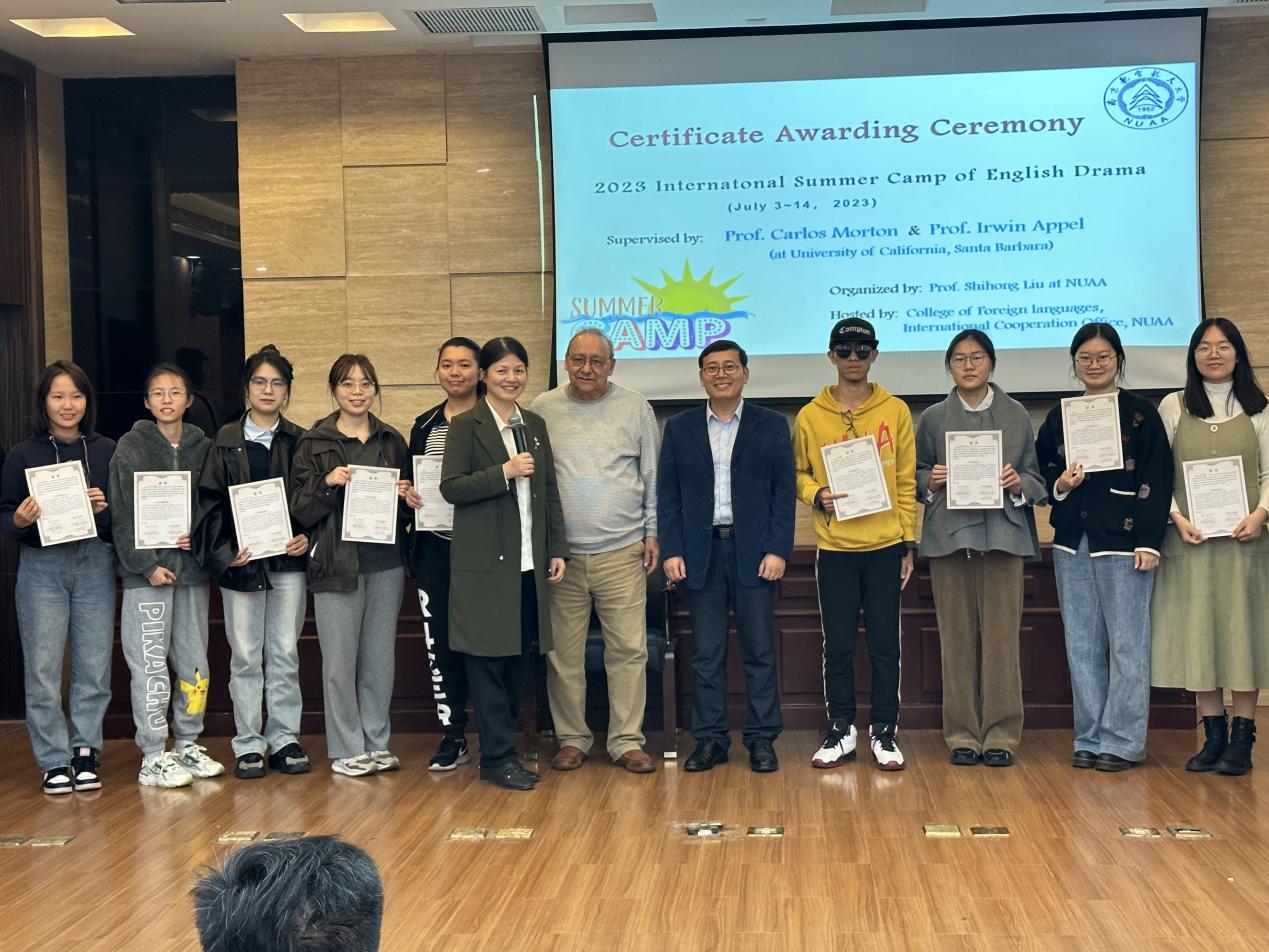 表演正式开始之前,进行了十三水在线 暑期国际课程“2023年度英语戏剧国际夏令营结营证书”发放仪式,该国际夏令营课程为十三水在线 策划的特色国际课程、也是院团委组织的大学生暑期社会实践活动,目前已经连续举办四期,由加州大学的两位教授卡洛斯·莫顿和欧文·爱普(Irwin Appel)联袂执教,成为暑期课程中的热门课程。十三水在线 副院长姜礼福教授和卡洛斯·莫顿教授亲自为学生们颁发了结营证书。