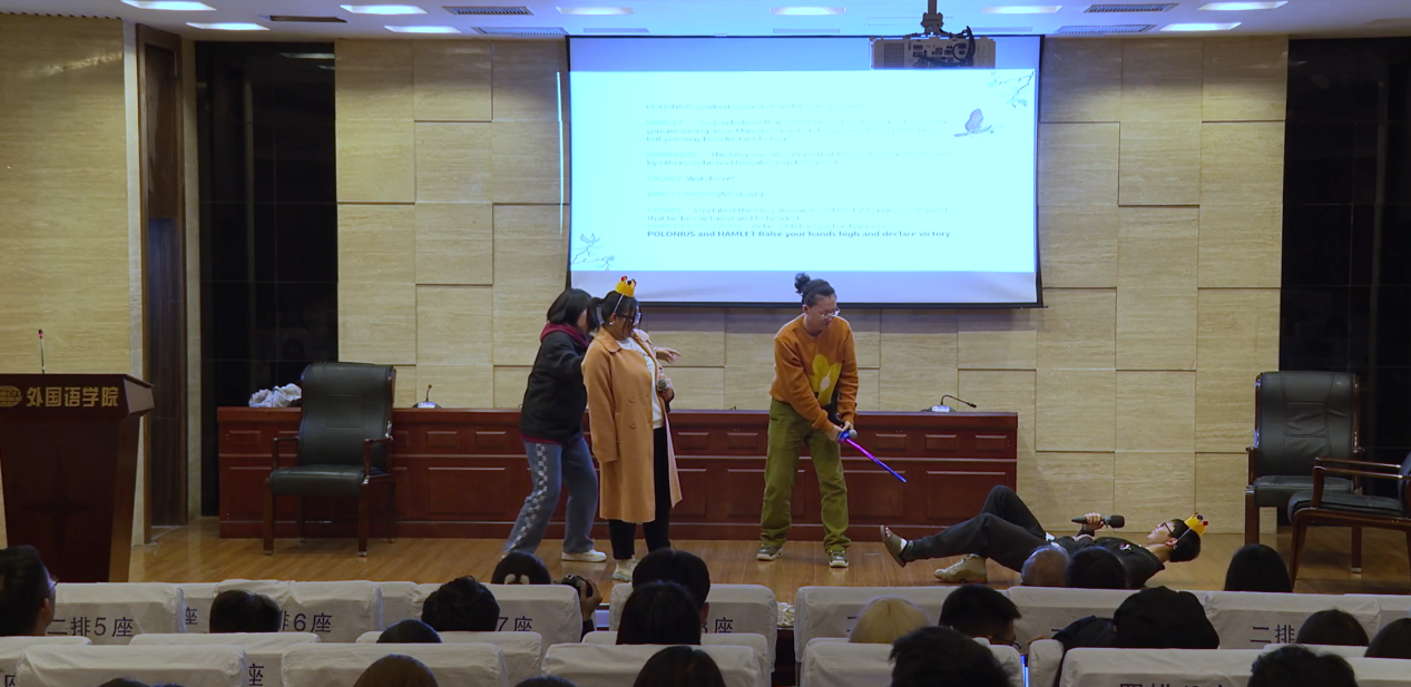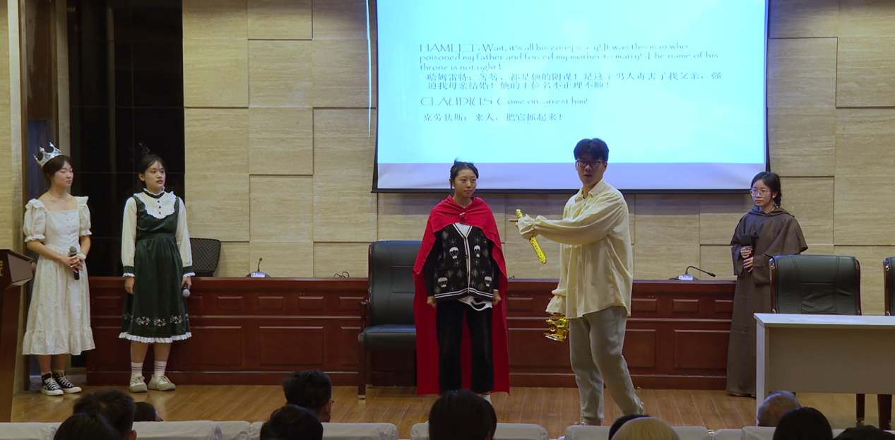 此次表演由卡洛斯·莫顿和刘世红共同指导,学生们自编、自导、自演了8部改编的戏剧作品,充分展示了学生们丰富的想象力和创造力,如丹麦王子哈姆雷特的恋人奥菲利亚精心设局,最终成功报复了把她当作复仇“工具人”的哈姆雷特王子;学生无意穿越到罗密欧与朱丽叶的世界,冒着生命风险,用智慧逆转了这对恋人悲剧的结局;戏剧家莎士比亚进入了自己创作的戏剧作品世界,对话罗密欧与朱丽叶、哈姆雷特等角色……情节跌宕起伏,富有戏剧张力。学生表演时情绪饱满,念白流畅,动作到位,落落大方,观众席不时爆发出热烈的掌声。表演的中间还穿插了中国民族舞等节目,娱乐放松的同时将中西文化进行了有机结合。