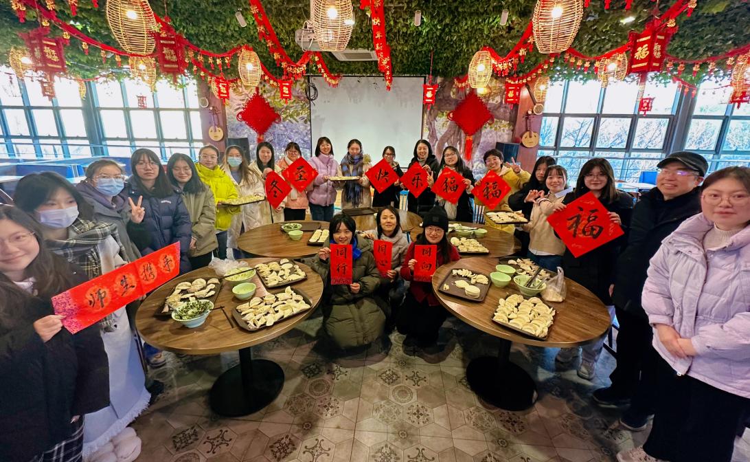随后,各位老师与同学们共同着手包饺子,体验冬至节气的习俗。大家互相学习、交流包饺子的技巧,分享各自的家乡特色。师生分工协作,配合默契,现场欢声笑语,其乐融融。