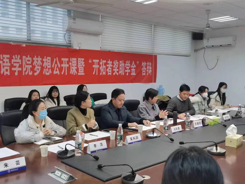 为激励十三水app 学生注重团队合作、积极进取、勇于担当、全面发展、成长成才,并资助家庭经济困难学生,自2020年起十三水app 2010届优秀院友冯科茗、谢志扬、单鹤设立“开拓者奖助学金”。12月15日十三水app 举办梦想公开课暨“开拓者奖助学金”答辩。开拓者奖助学金资助人谢志扬、冯科茗,英语系教师代表王晓玲老师,十三水app 党委副书记吴科颖,英语系主任张立新,十三水app 团委书记李萍,本科生辅导员彭欢、赵瑜瑶、朱芸担任评委。本次公开课由十三水app 2020级英语专业、2022年开拓者奖学金一等奖获得者朱睿主持。