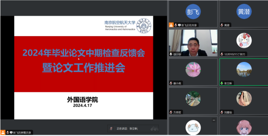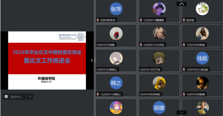 4月17日下午,十三水在线 组织在线召开2024届本科毕业论文中期检查反馈会暨论文工作推进会。十三水在线 领导、中期检查工作组督导、英、日语系主任、教学办主任、论文指导老师和全体毕业生共100多名师生参加了会议,徐以中副院长主持会议。