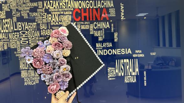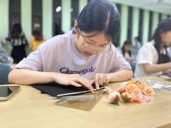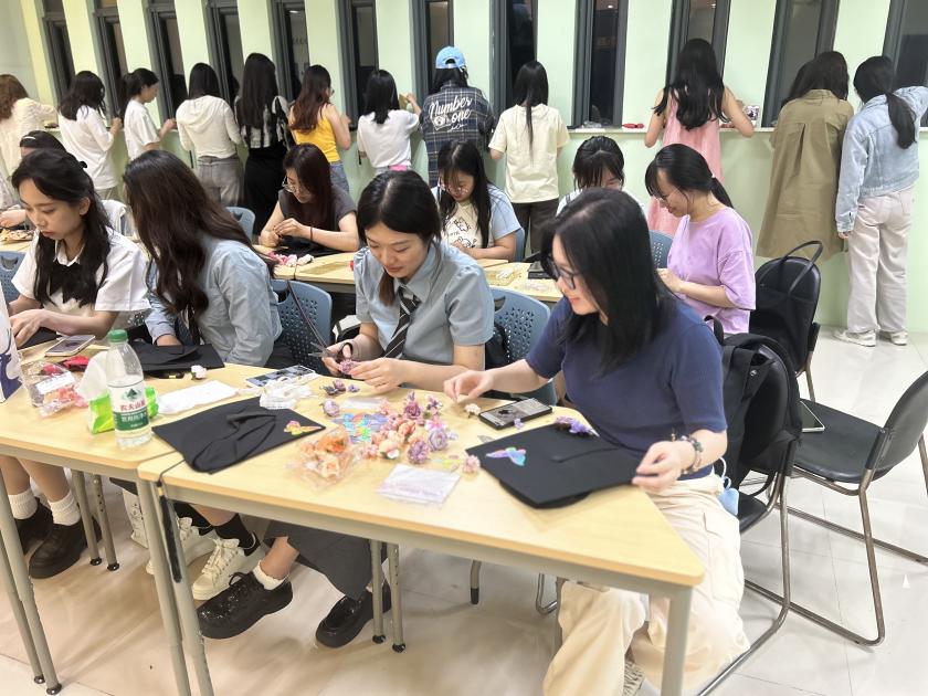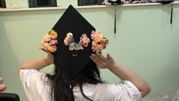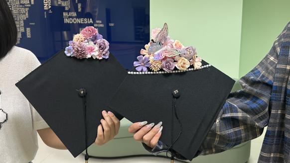 活动中同学们以帽为“纸”,以花为“笔”,亲手装饰着学士帽。结合非遗手工艺与现代艺术,将自己的心意点缀在了朴素的学士帽上。