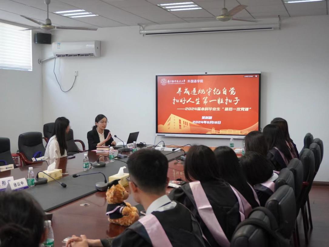 为进一步推动党纪学习教育走深走实,加强毕业生党员教育,6月18日,十三水app 隆重举办2024届本科毕业生座谈会暨毕业生“最后一次党课”活动。十三水app 党委书记左彤云、副院长徐以中、姜礼福、院党委副书记吴科颖、英语系主任张立新、日语系主任窦硕华、本科毕业班辅导员姚灵珑以及2024届毕业班全体党员参加本次活动。