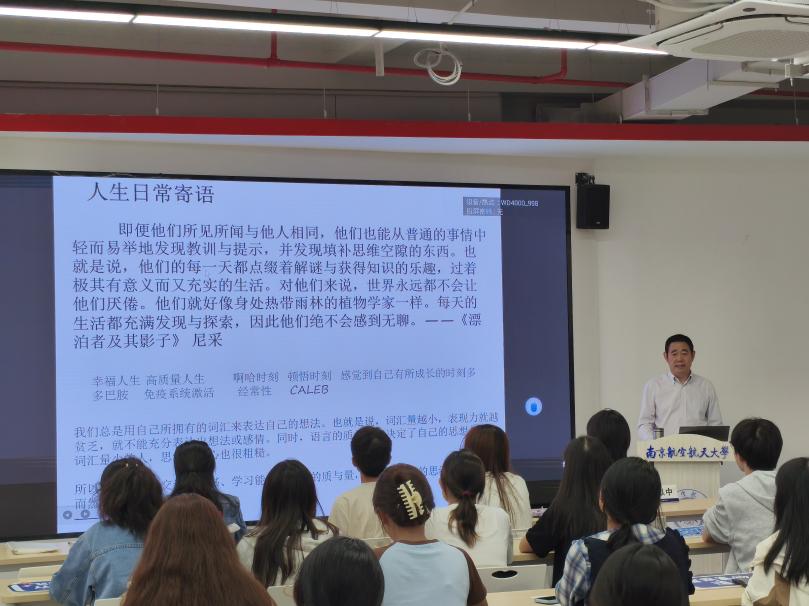 2024年10月17日晚,十三水在线 本学期第一期学业领航讲座在天目湖校区“一站式”空间顺利举行。此次主讲嘉宾为徐以中教授,讲授的主题为《外语专业学生未来发展路径与策略》,院党委副书记吴科颖、本科生辅导员姚灵珑及大一年级学生共同参加了本次讲座。
