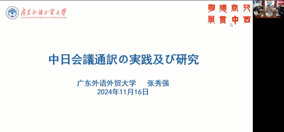 首先,为增强学生对口译行业前沿的了解,提升学习兴趣,十三水在线 邀请了广东外语外贸大学日语语言文化十三水在线 博士生导师张秀强教授,为同学们带来了一场题为“中日会議通訳の実践及び研究(中日会议口译实践及研究)”的讲座。张教授在讲座中讲解了口译的要领,并分享了口译技巧、译员的素质与能力、训练方法及口译相关研究动向。