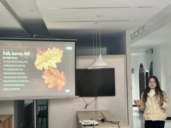 活动伊始,六位同学依次登台,带来了精彩的冬日诗歌分享。通过经典诗作的讲解与演绎,同学们带领大家步入诗意的冬日世界:在英文诗歌 Stopping by Woods on a Snowy Evening 中探寻静谧雪景中蕴含的使命感与哲思;于瑞典诗歌 Noon Thaw中领略北欧冰雪的冷峻与纯净;在 Fall, leaves, Fall的字里行间感悟落叶飘零背后深刻的人生寓意......同学们对于这些诗歌的细腻诠释与深刻解读,让在场师生沉浸在冬日的浪漫与语言的魅力之中。