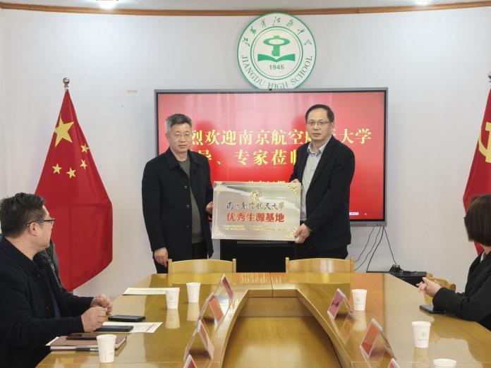 招生组最后一站来到江苏省江都中学,江都中学党委书记高小兵,党委副书记、副校长褚朝顺,副校长季娴,高三年级主任周斌、殷文俊等参加座谈交流。高小兵代表江中对南航长期以来给予的支持表示感谢。双方就如何吸引优质生源、优化招生政策等问题进行了深入探讨。活动最后,双方共同为“优秀生源基地”揭牌,标志着两校将持续深化招生-培养-升学全链条合作,推动“双高”协同育人进入新阶段。