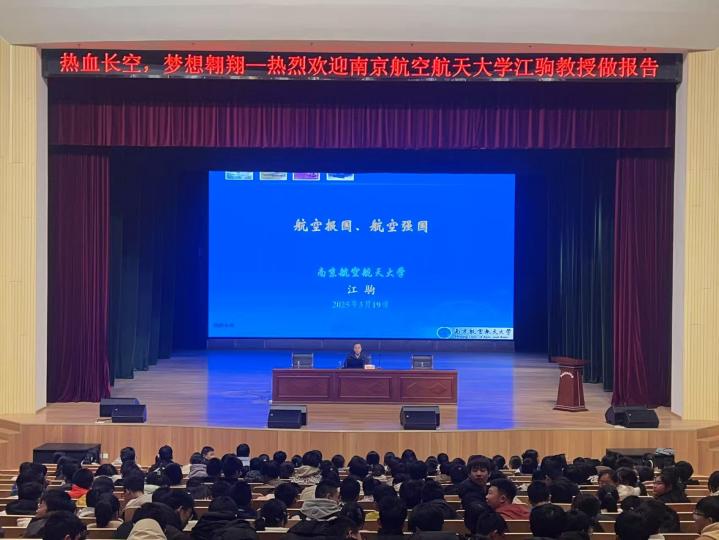 江驹面向仪征中学高一年级全体同学作了题为“航空报国、航空强国”的主题讲座。他生动讲述了我国航空工业的发展历程,激发起同学们对航空航天领域的探索热情。同时,他介绍了南航在航空航天领域的学科特色、专业优势以及“为党育英才、为国铸重器”的使命担当,让同学们对南航的学术底蕴和报国情怀有了更深刻的认识。
